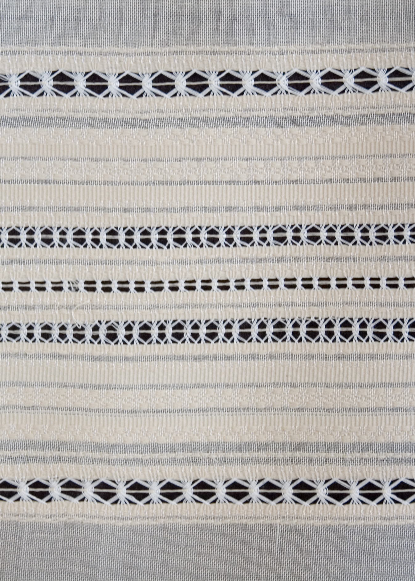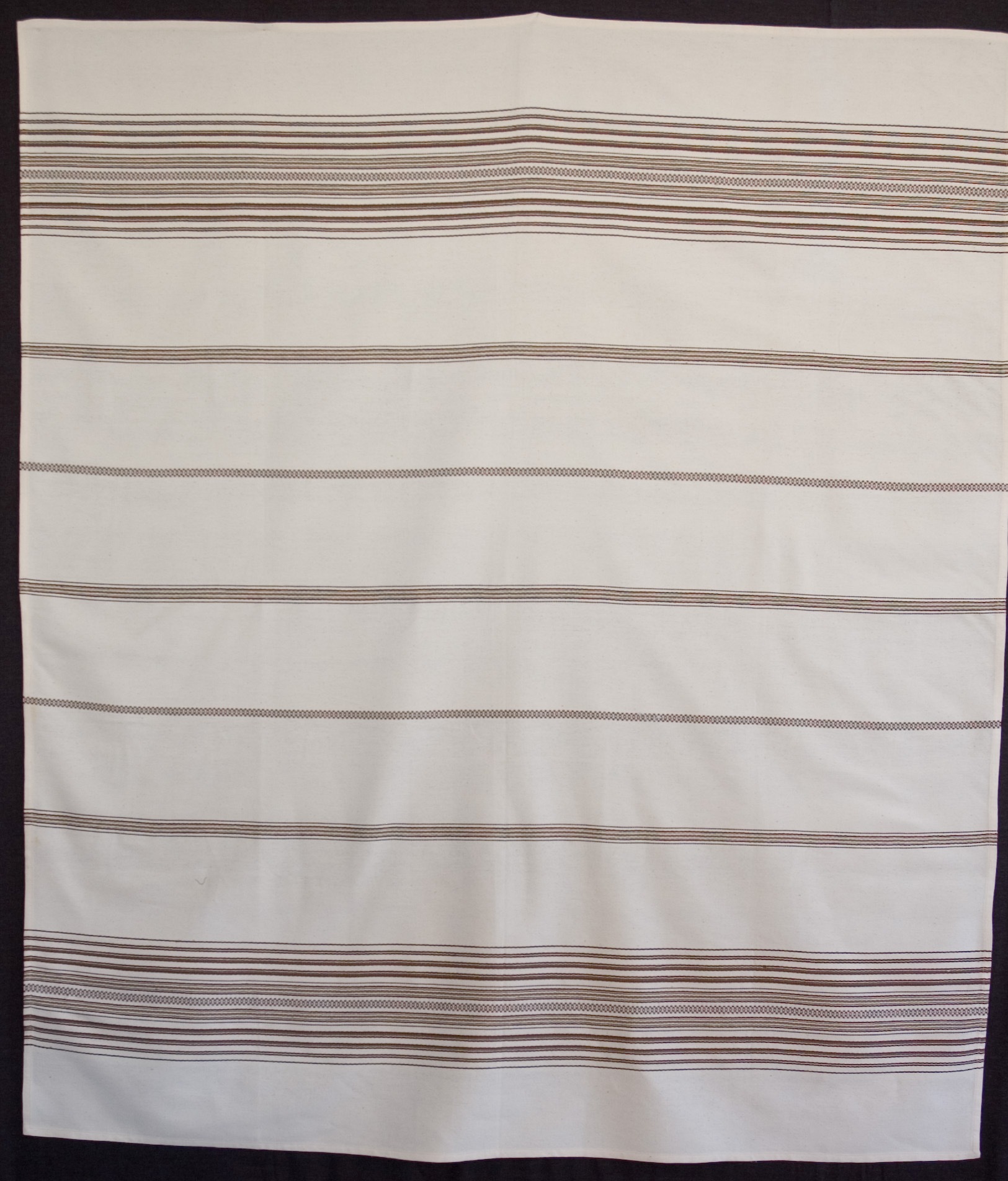 | Tárgyleírás | Az abrosz két szélén erősebben, majd középen szellős felületet biztosító,vászon alapú, eltérő vastagságú fogazott ripsz-csíkokkal díszített használati tárgy. | |||