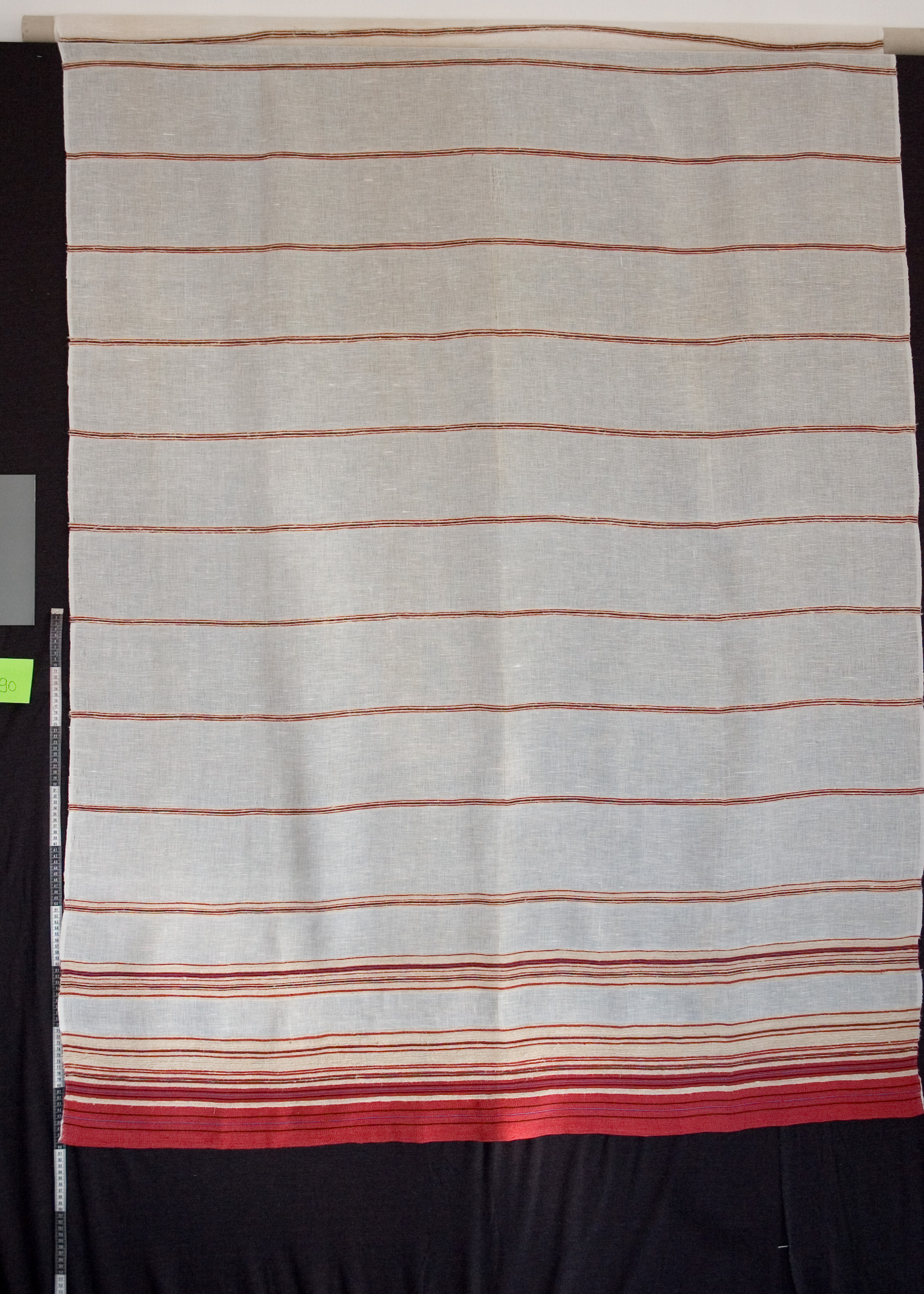 | Tárgyleírás | Az abrosz két végét piros-kék ripsz csíkok díszítik. | |||