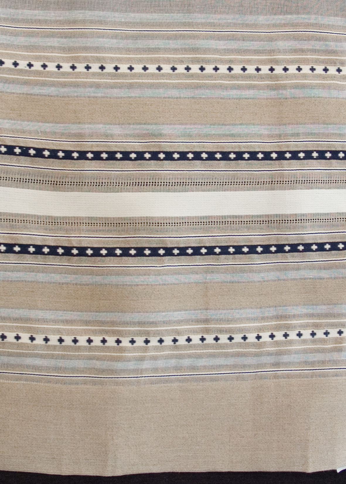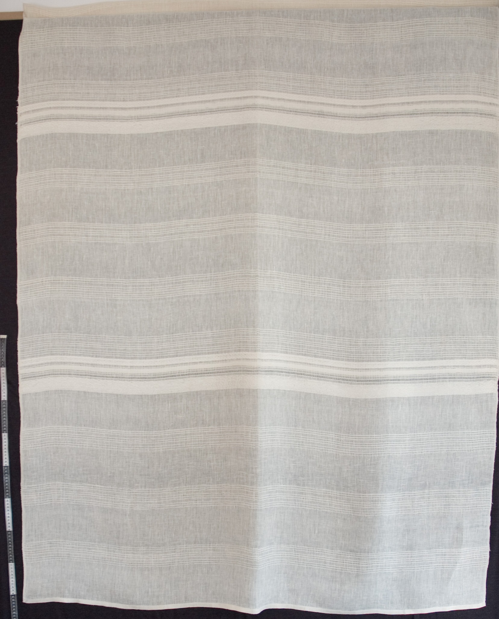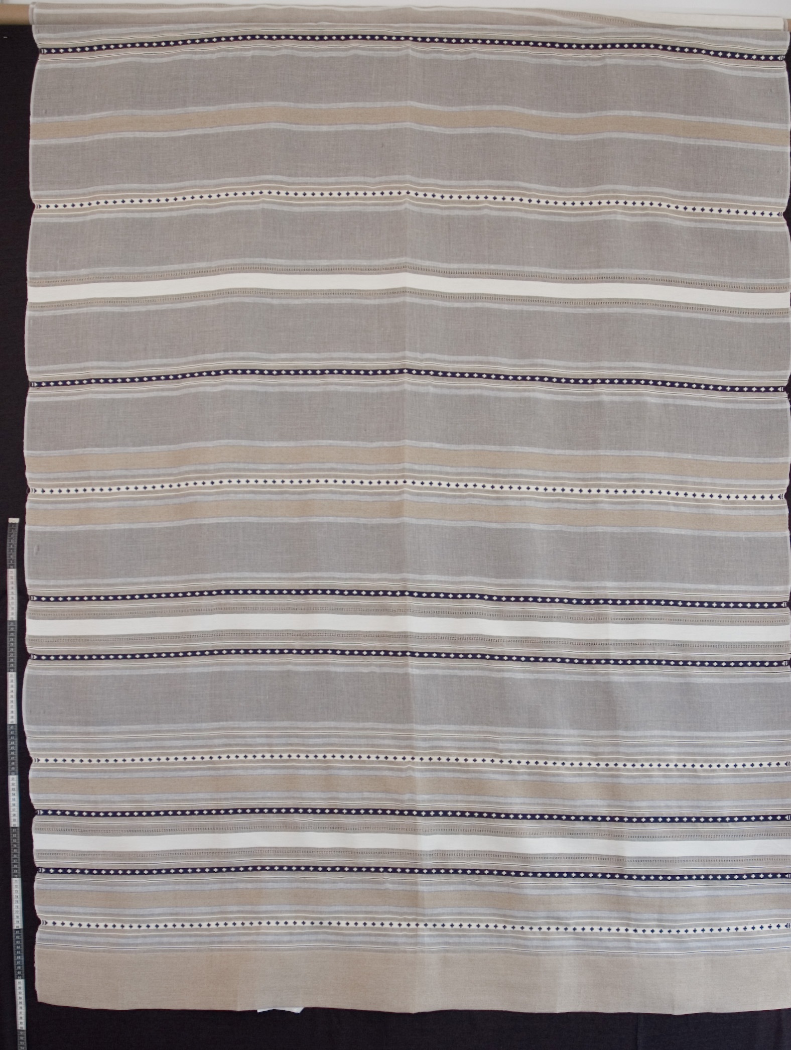 | Tárgyleírás | A lenszáda felületét szürke-nyers szatén csíkok és sötétkék lépett minták díszítik. | |||