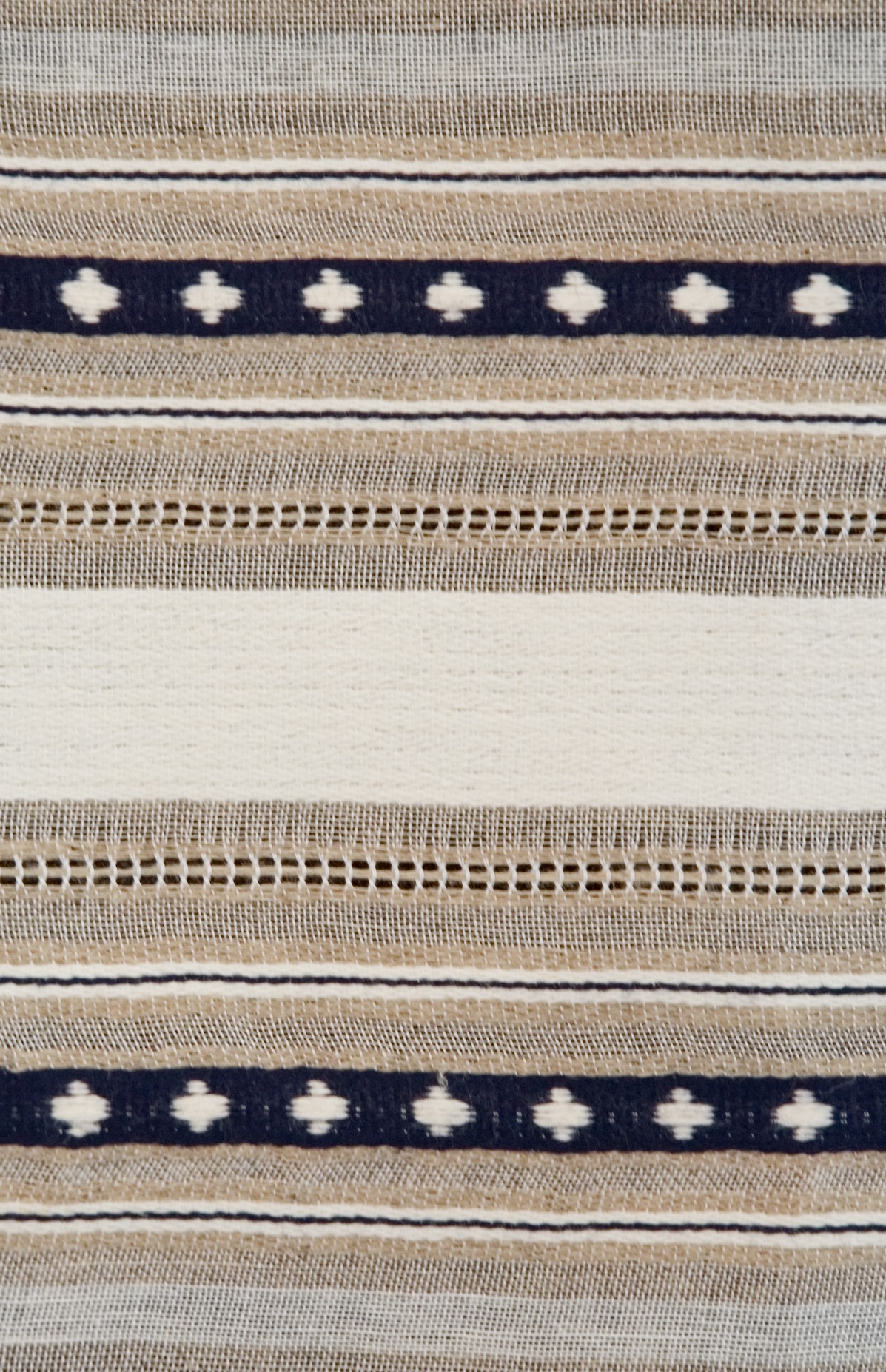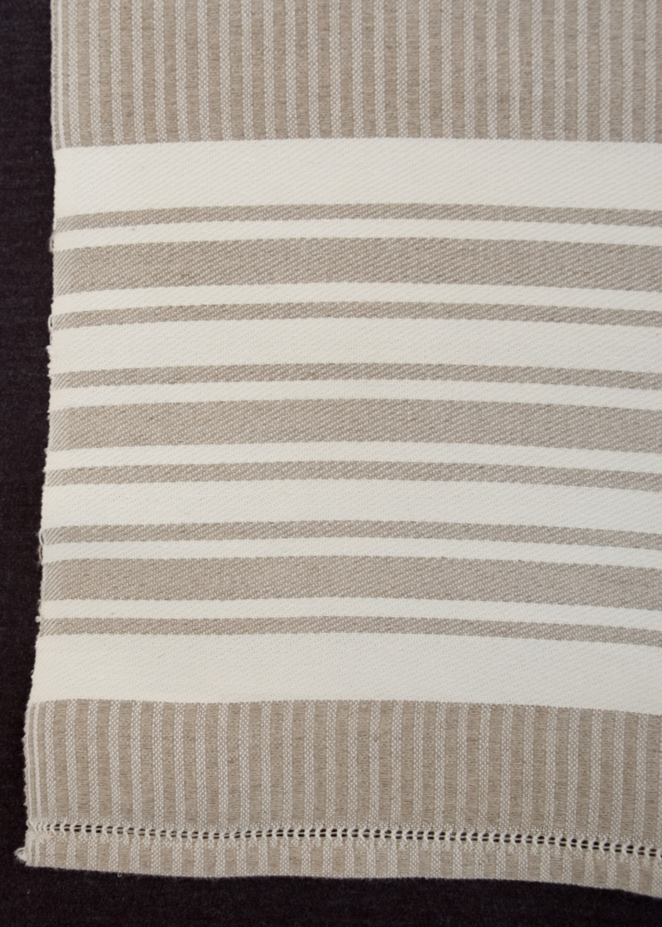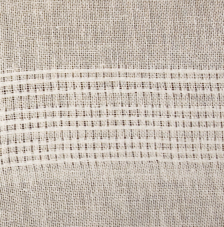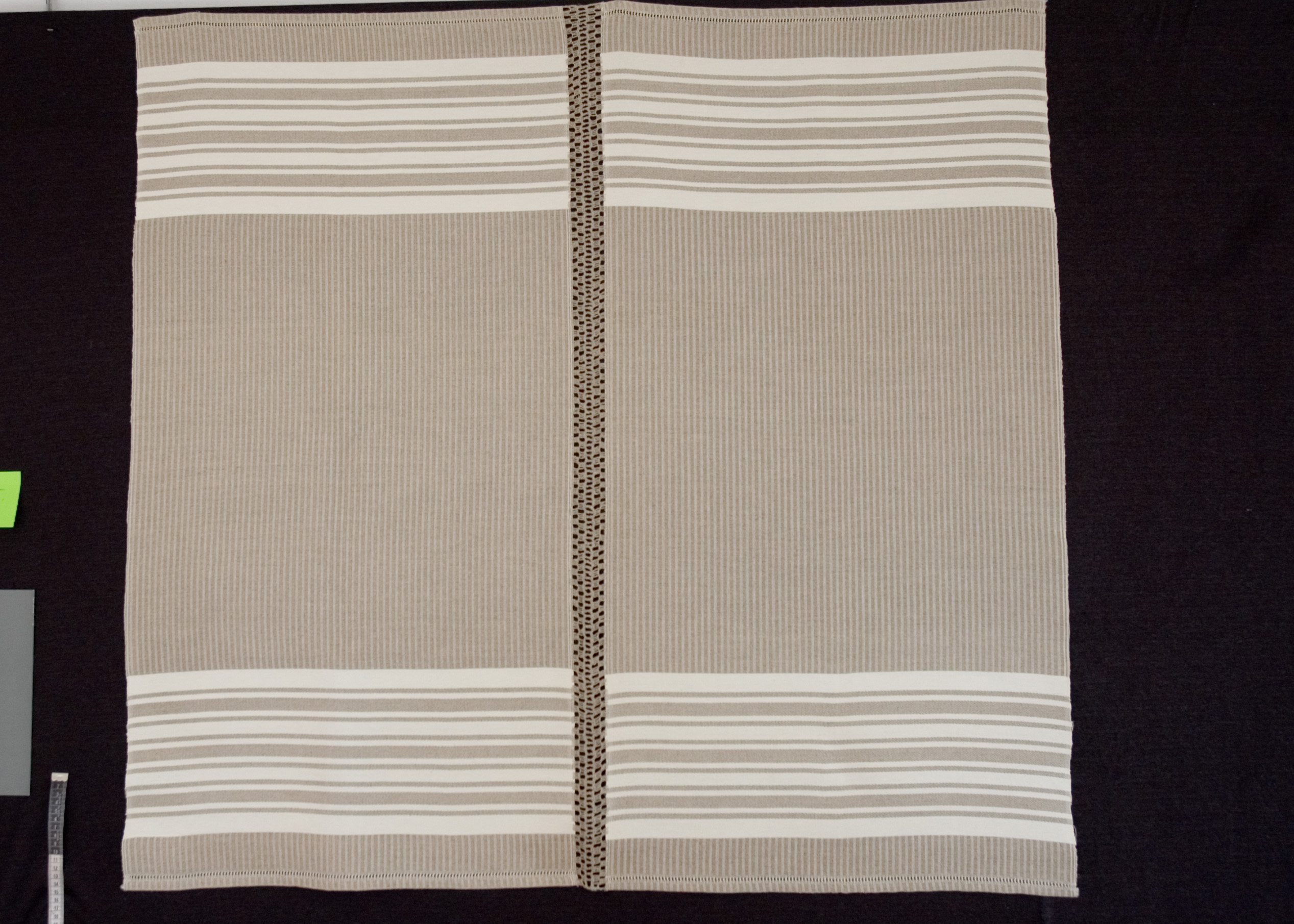 | Tárgyleírás | A lenszáda felületét szürke-nyers szatén csíkok és sötétkék lépett minták díszítik. | |||
