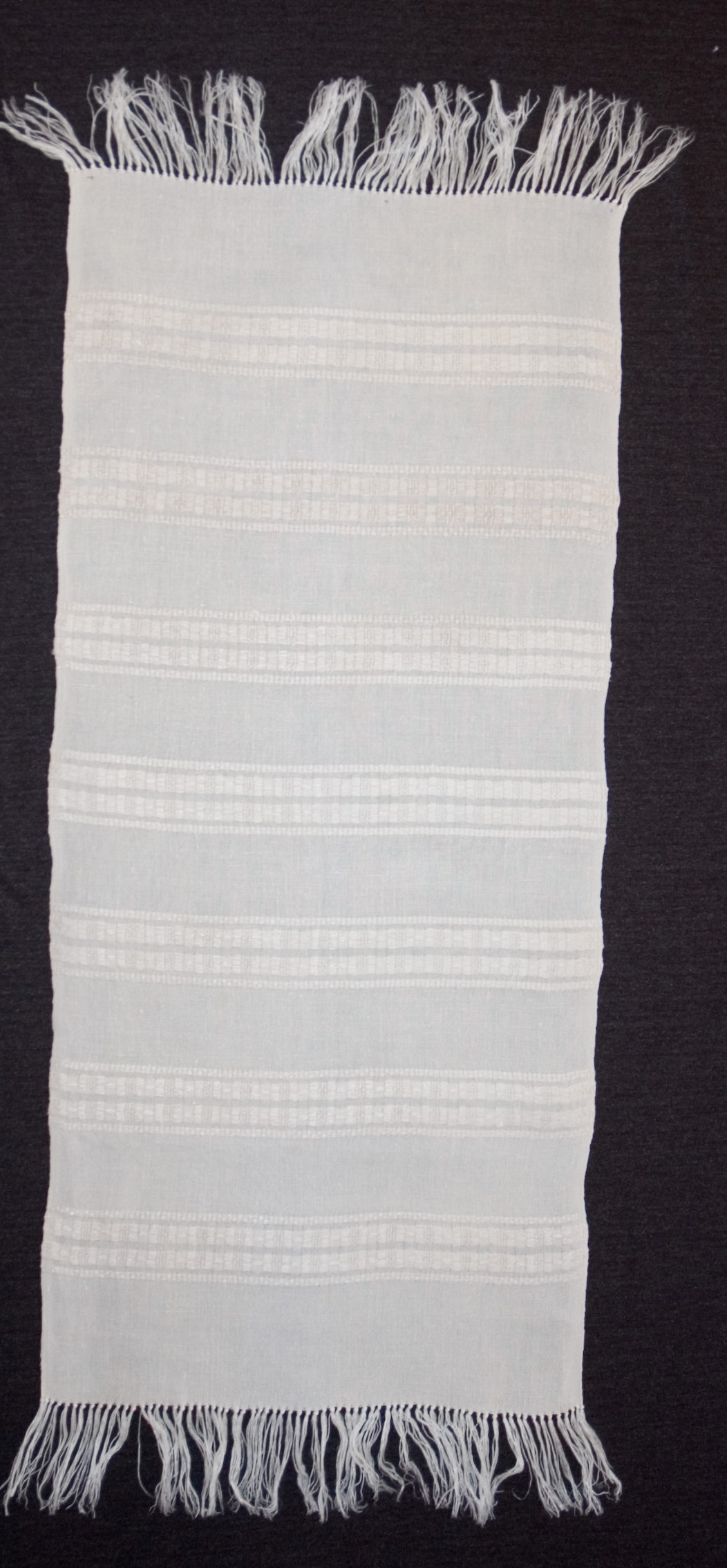| Tárgyleírás | A futót szedett szegfű minta díszíti, amelyet azsúrral, ripsz csíkkal hangsúlyoz az alkotó. A tárgy két végét kötött rojt díszít. | |||