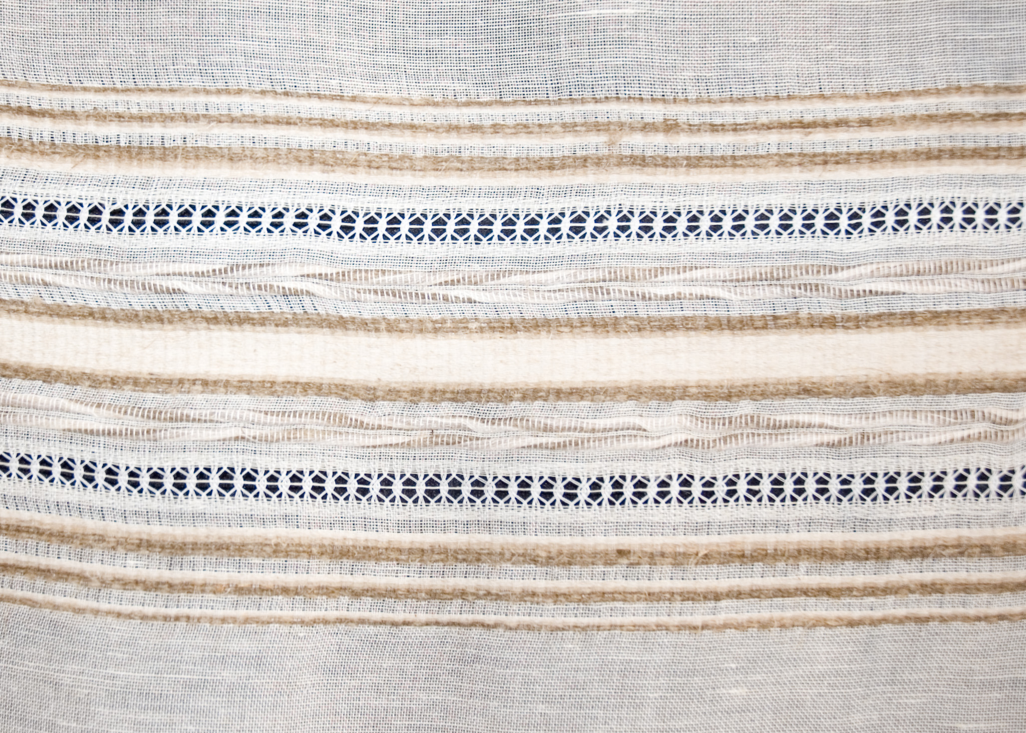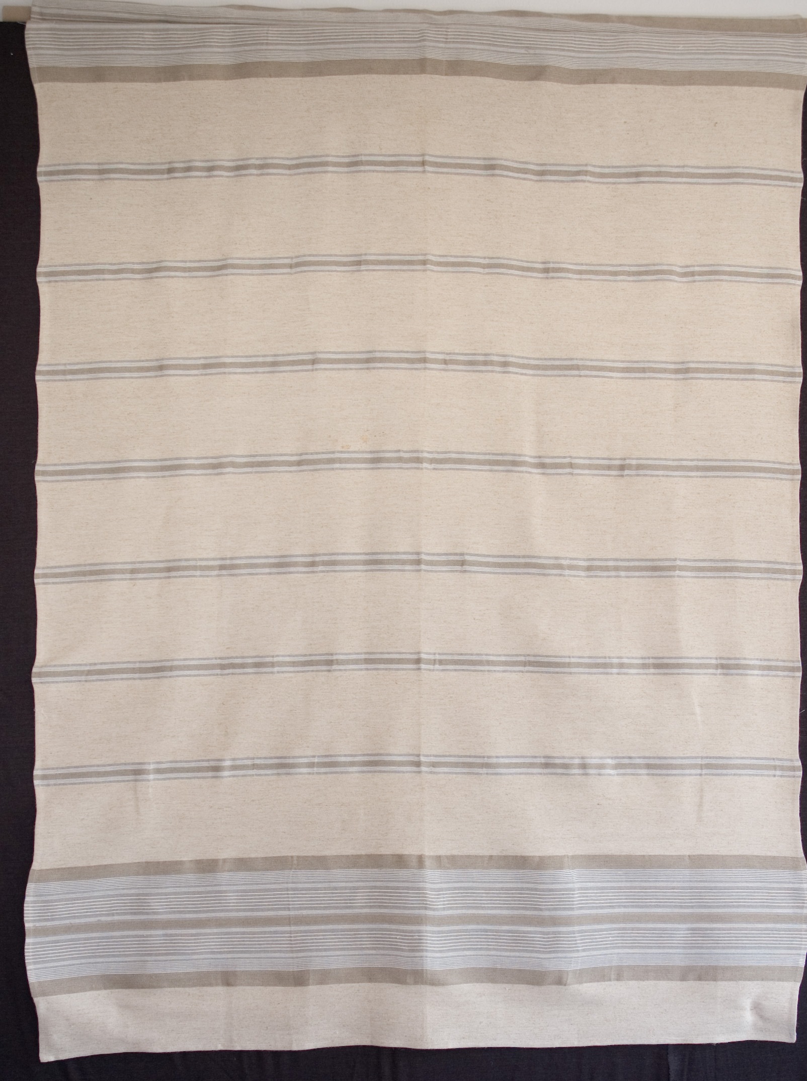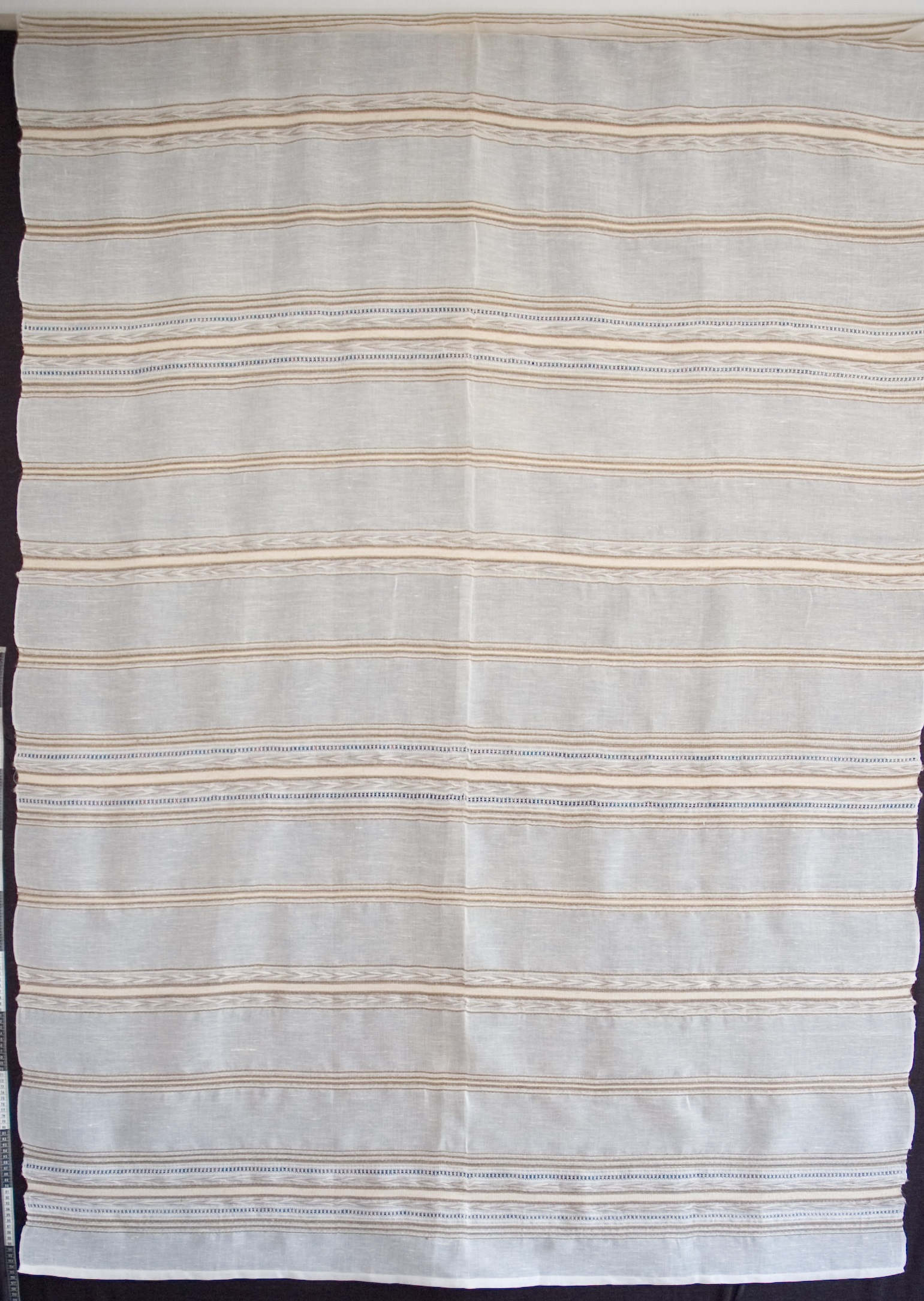 | Tárgyleírás | Az alkotás szélét szimmetrikusan díszítő, a len színárnyalataiból álló szélesebb csík-minta a felületen visszafogottan, a használati funkciót erősítve jelenik meg. | |||