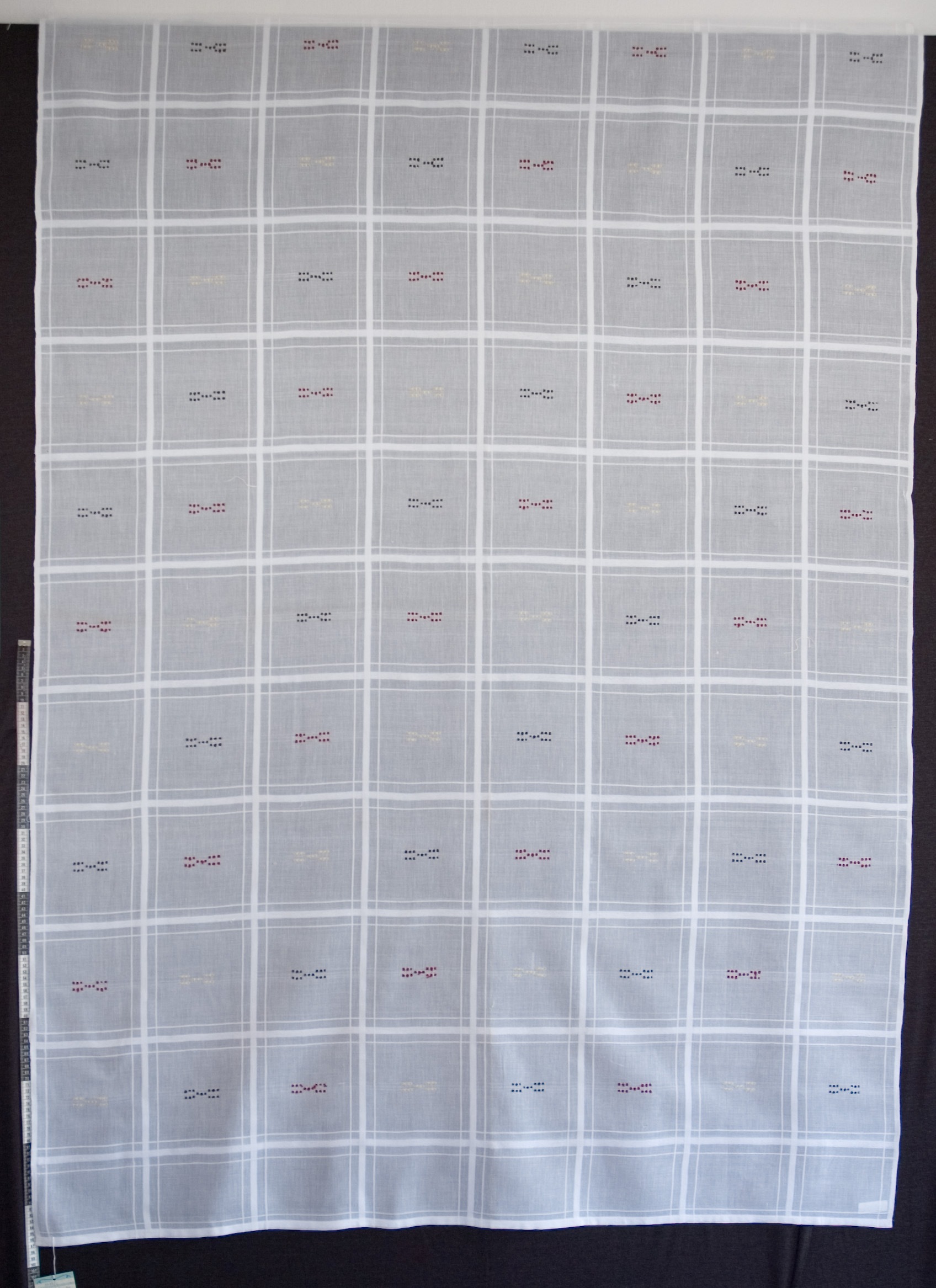 | Tárgyleírás | A nagy kockás szádát befűzött, színes motívumok teszik változatossá. | |||