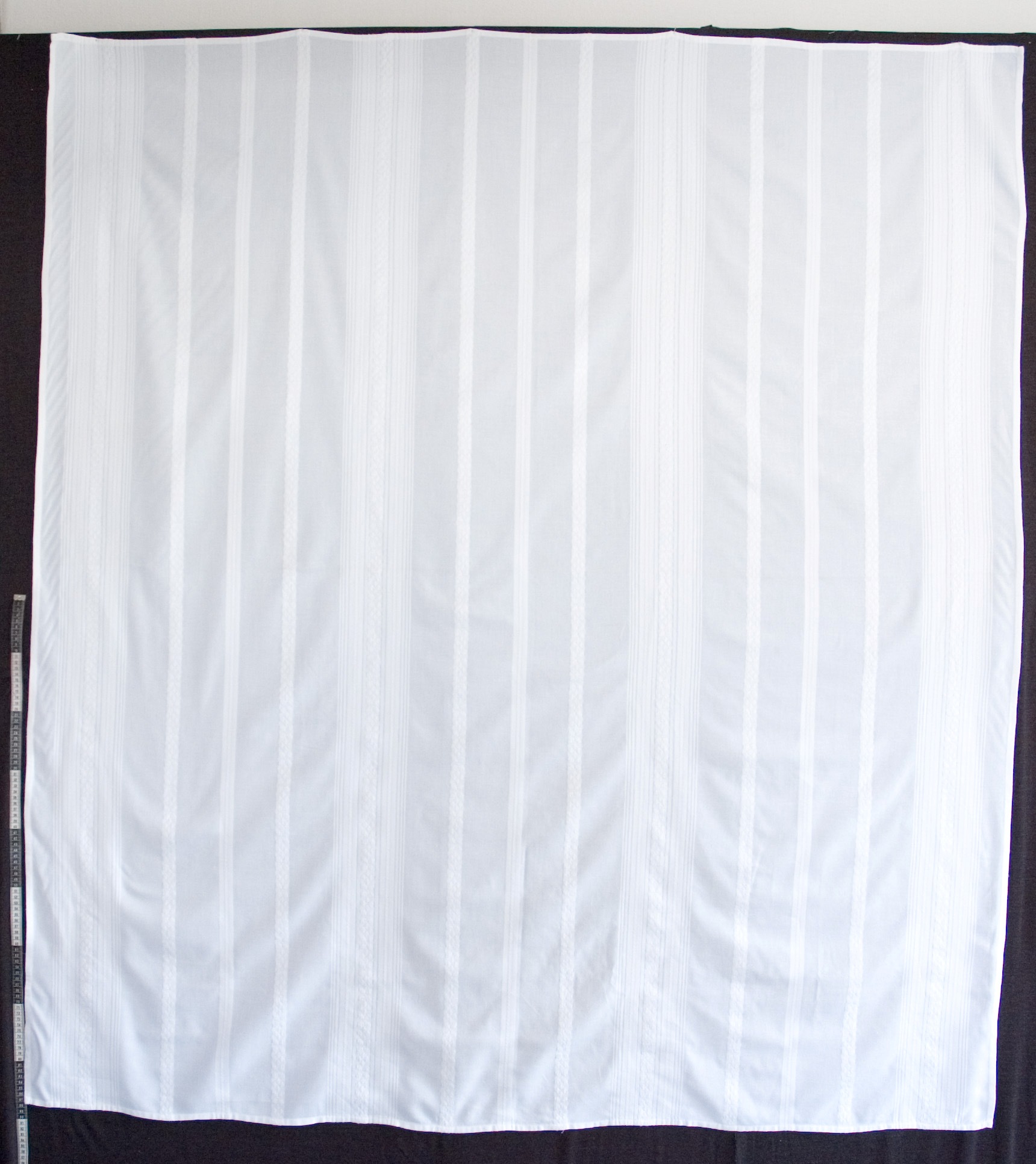 | Tárgyleírás | Az abroszt a ripsz-csíkokkal kiemelt, szedett herelevél-minta díszíti arányos elosztásban. A fő mintákat a felületet díszítő, kiegészítő minta köti össze. | |||