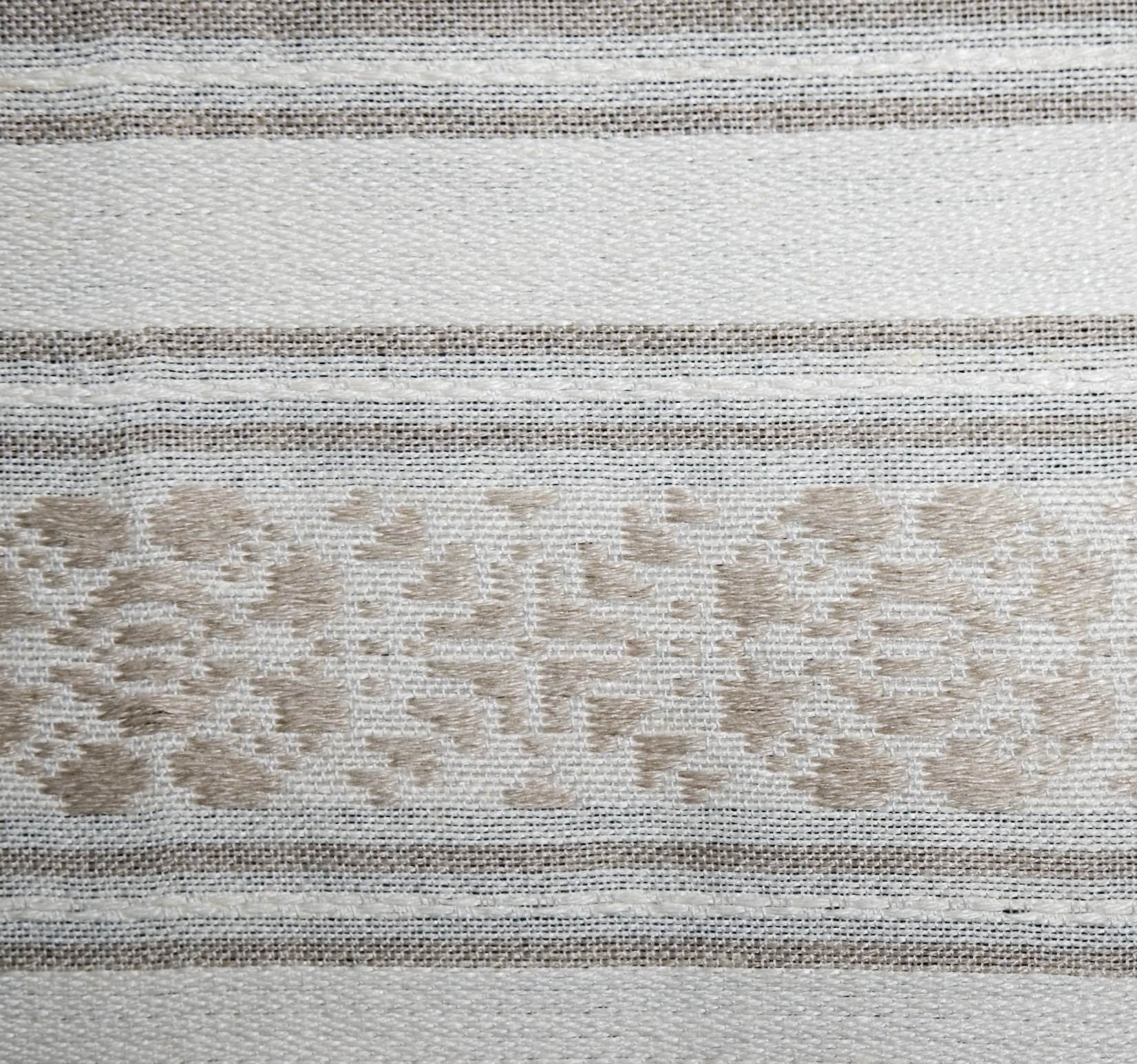 Tárgyleírás: | Az abrosz két végén szélesebb szatén csík, majd három soros szedett minta, szatén csíkkel és azsúrral hangsúlyozva található. Közepén egy-egy sor szedett minta, és a szatén csík váltja egymást. |