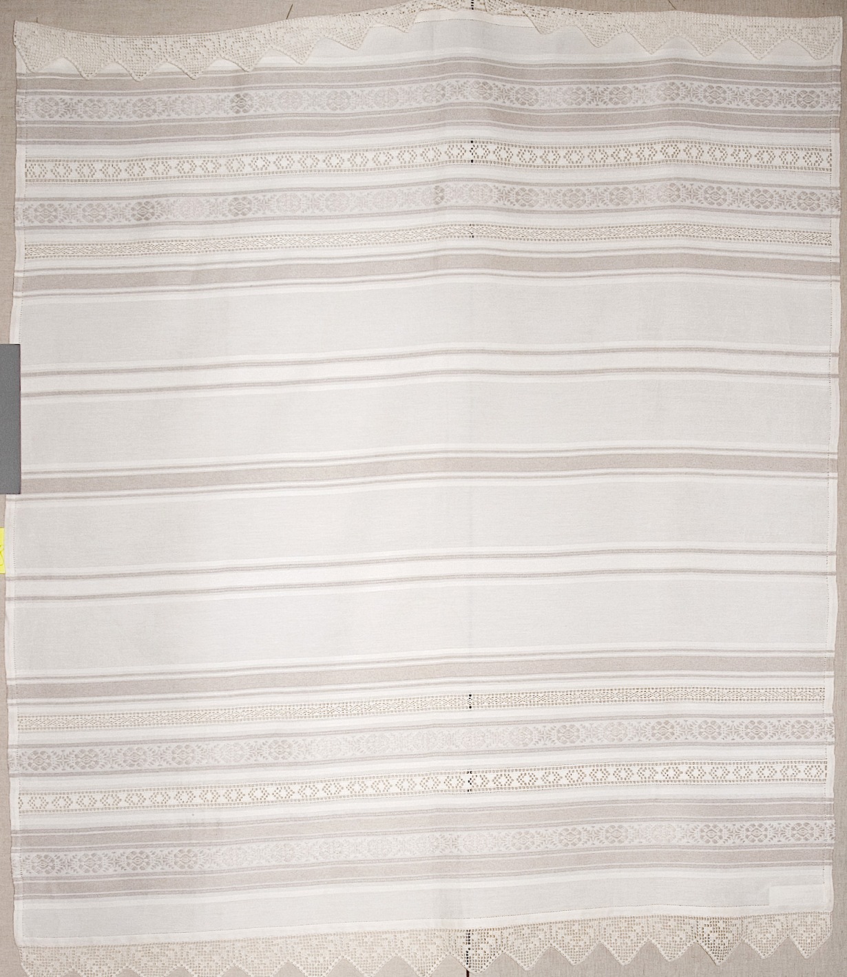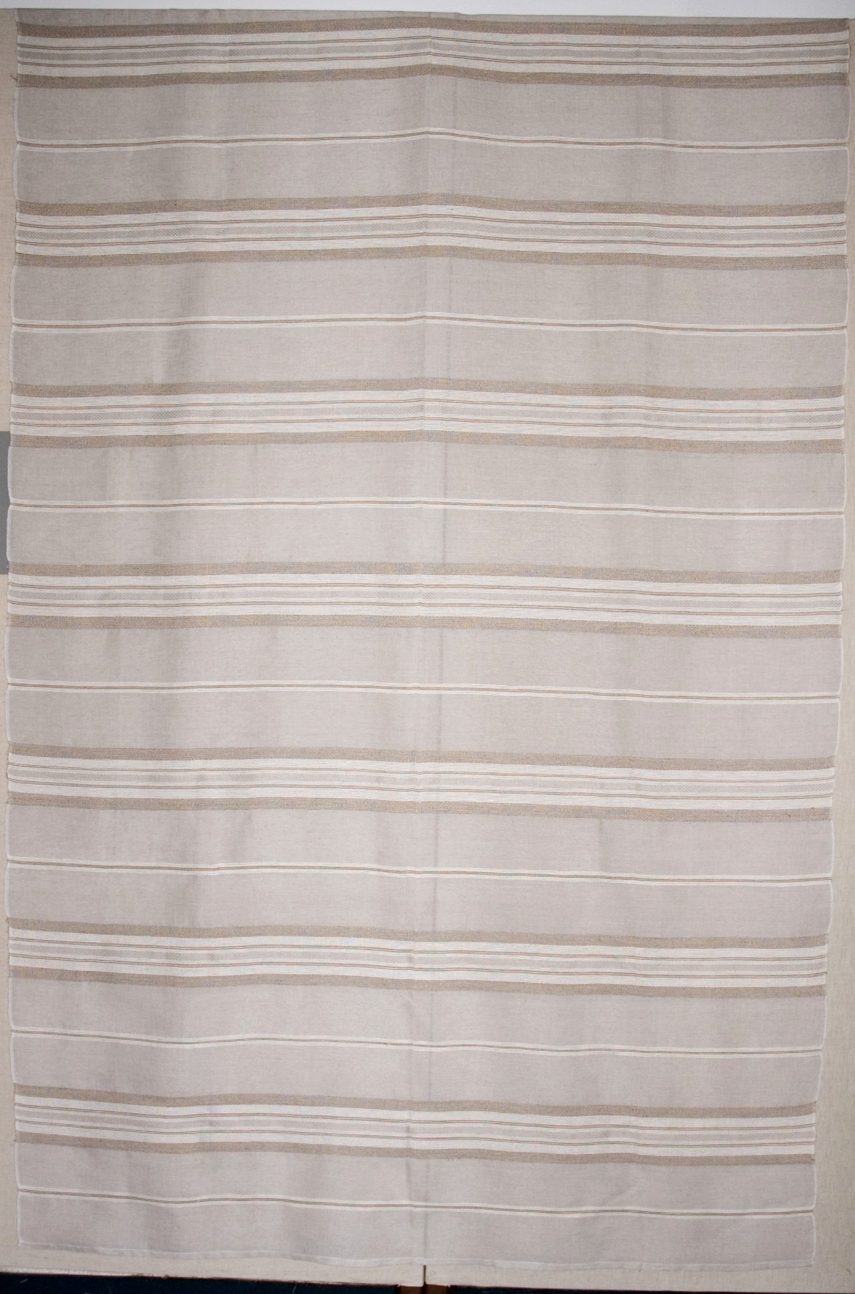| Tárgyleírás | 140x260 cm fehér len alapú, szürke len csíkozású száda függönyla | |||