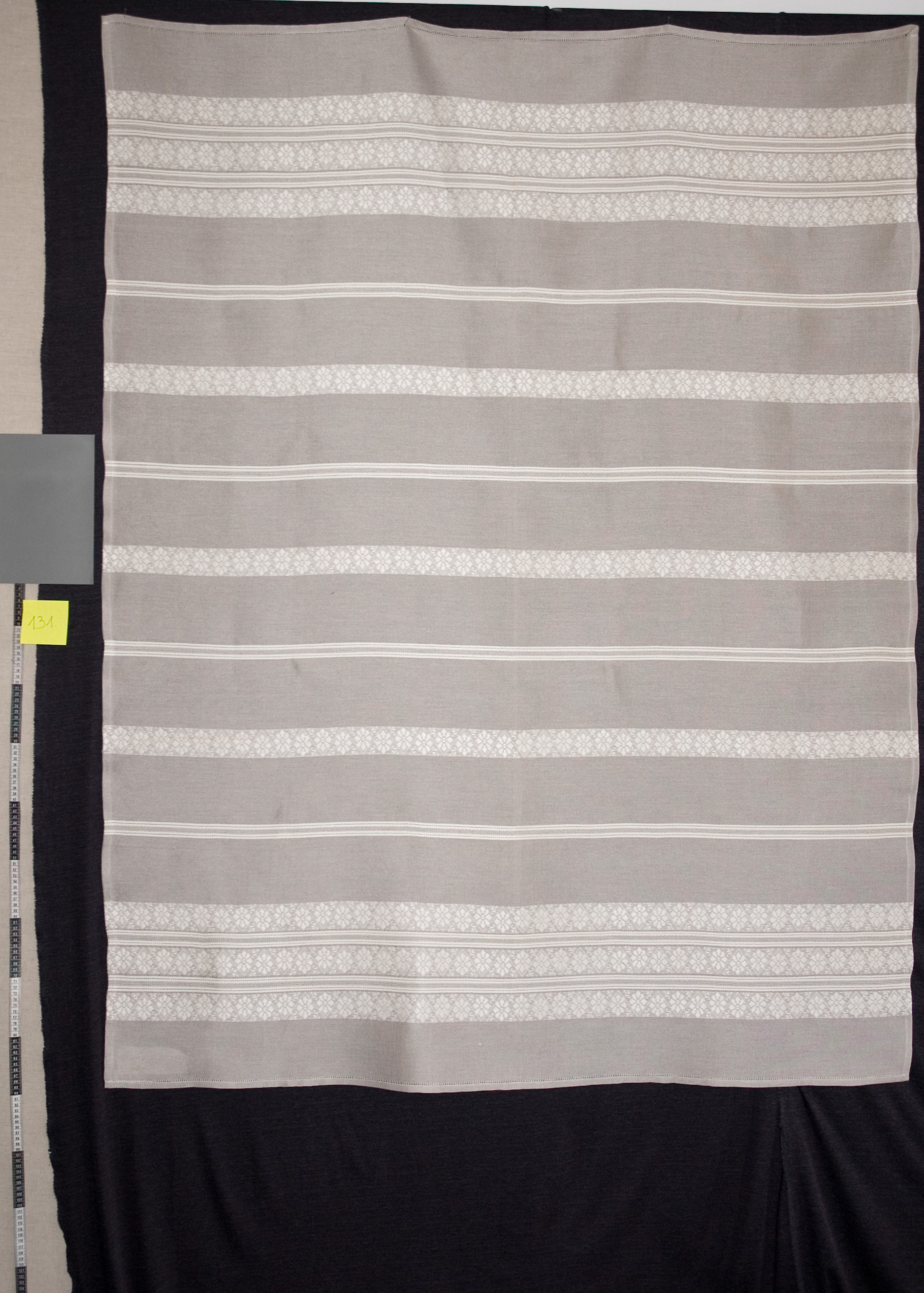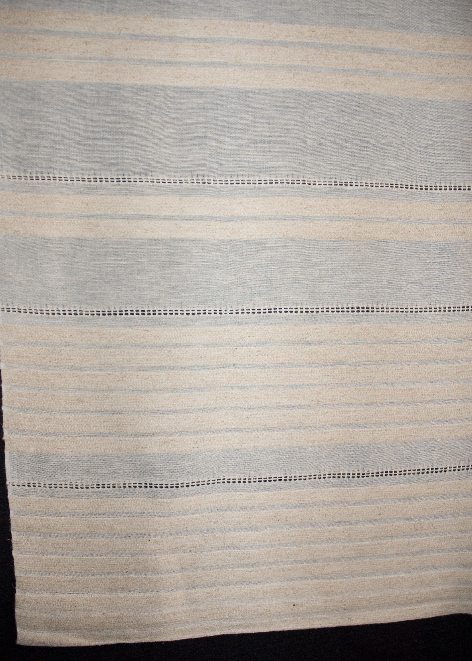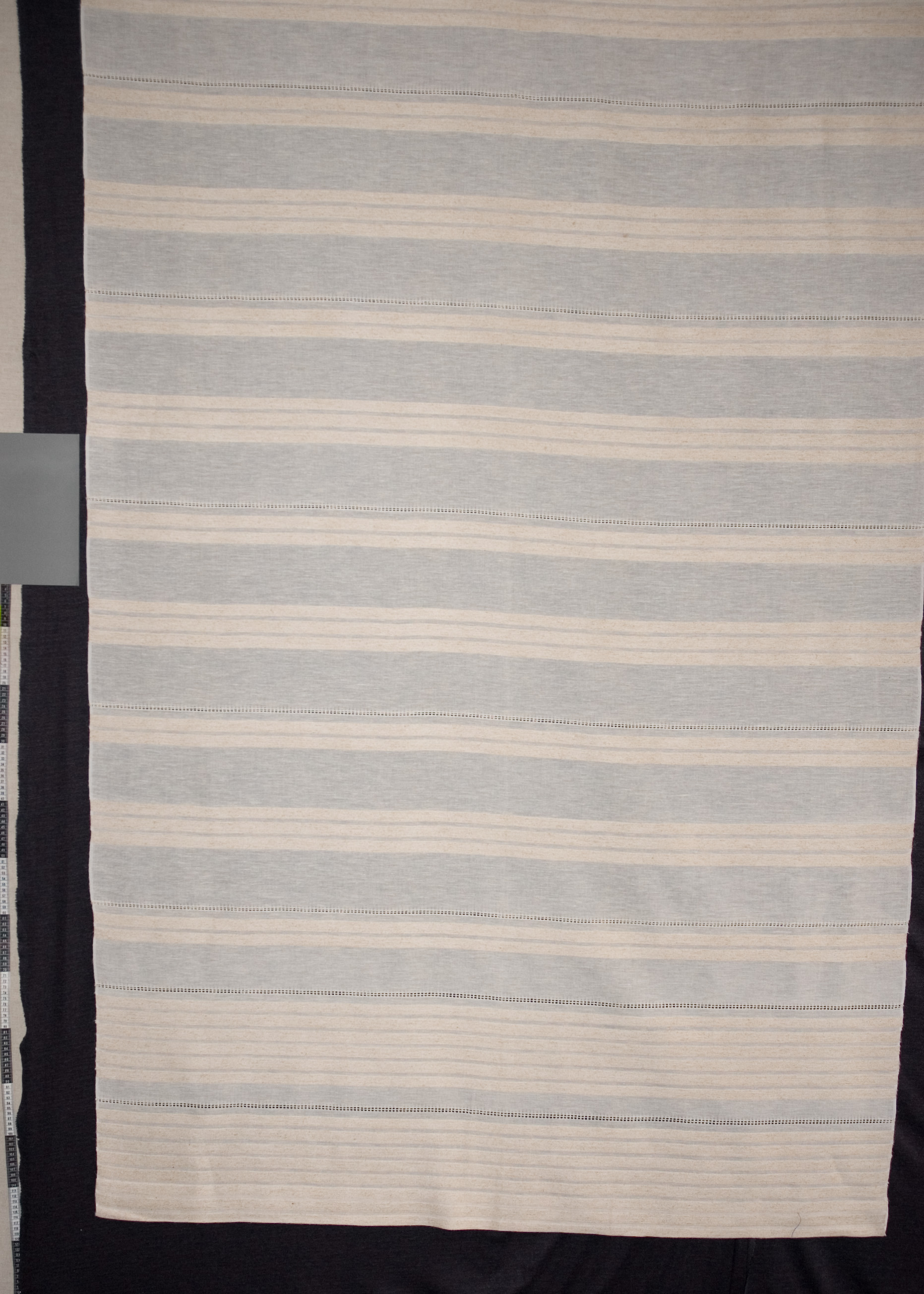 | Tárgyleírás | Az abrosz két végét szélesebb, a palóc párnavégeken fellelhető kender anyagú csíkritmus díszíti, amely a belső felület felé egyszerűsödik. Az abrosz két végét azsúr díszíti. | |||