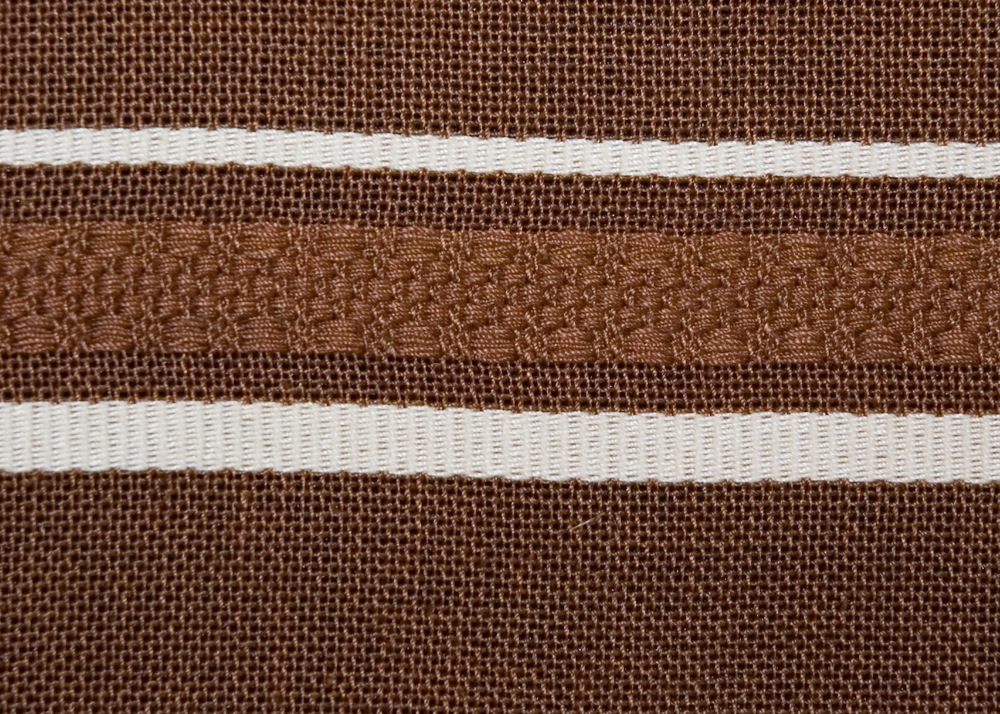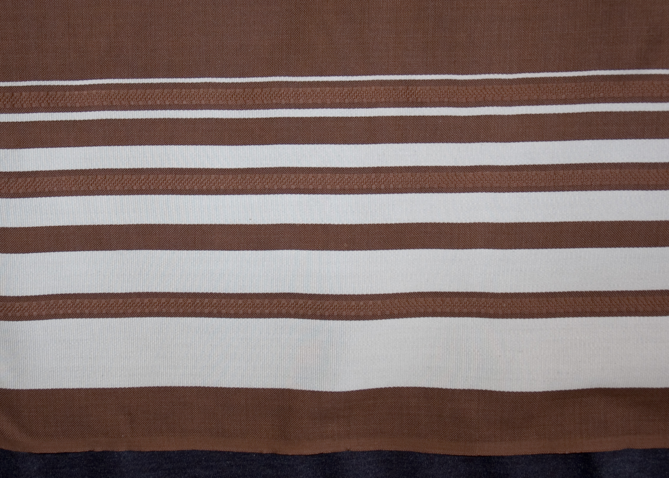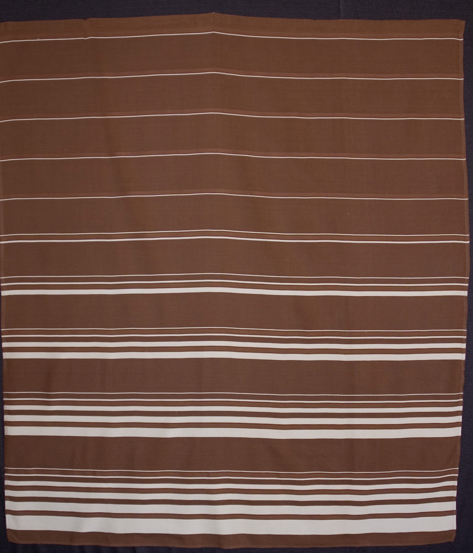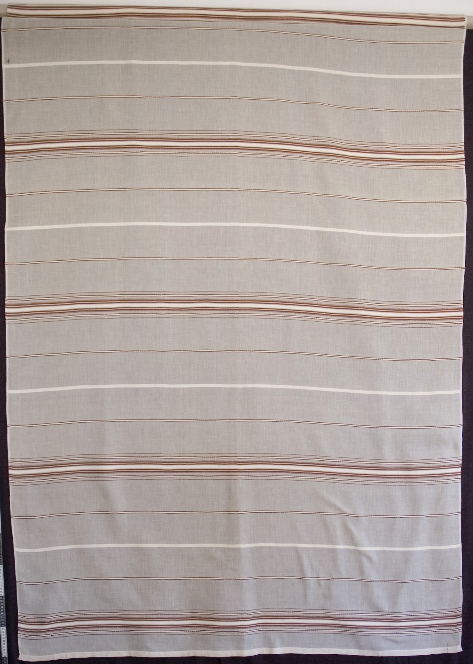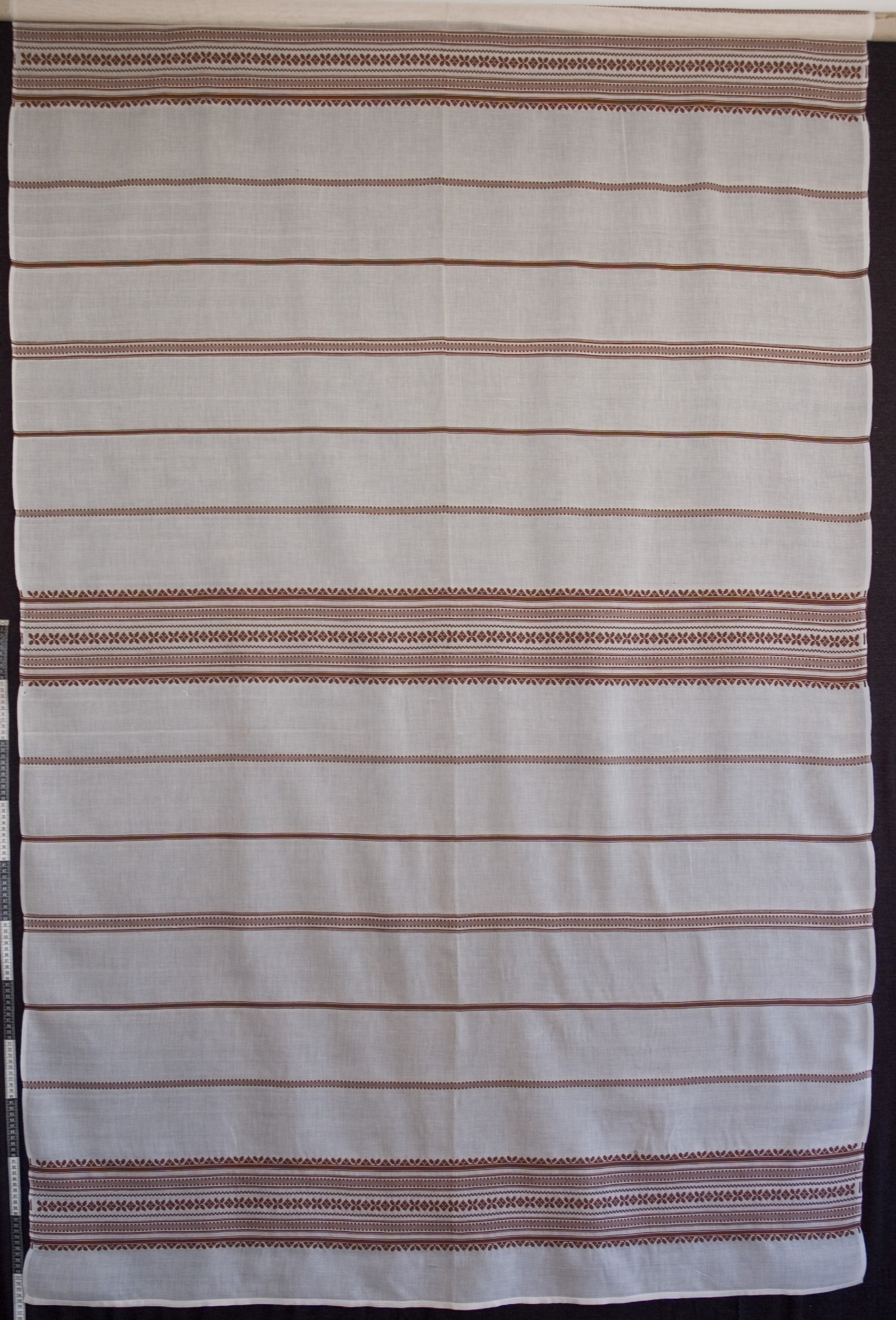 | Tárgyleírás | A barna alapú sötétítő függöny a palóc párnavégek csíkritmusait dolgozta fel