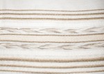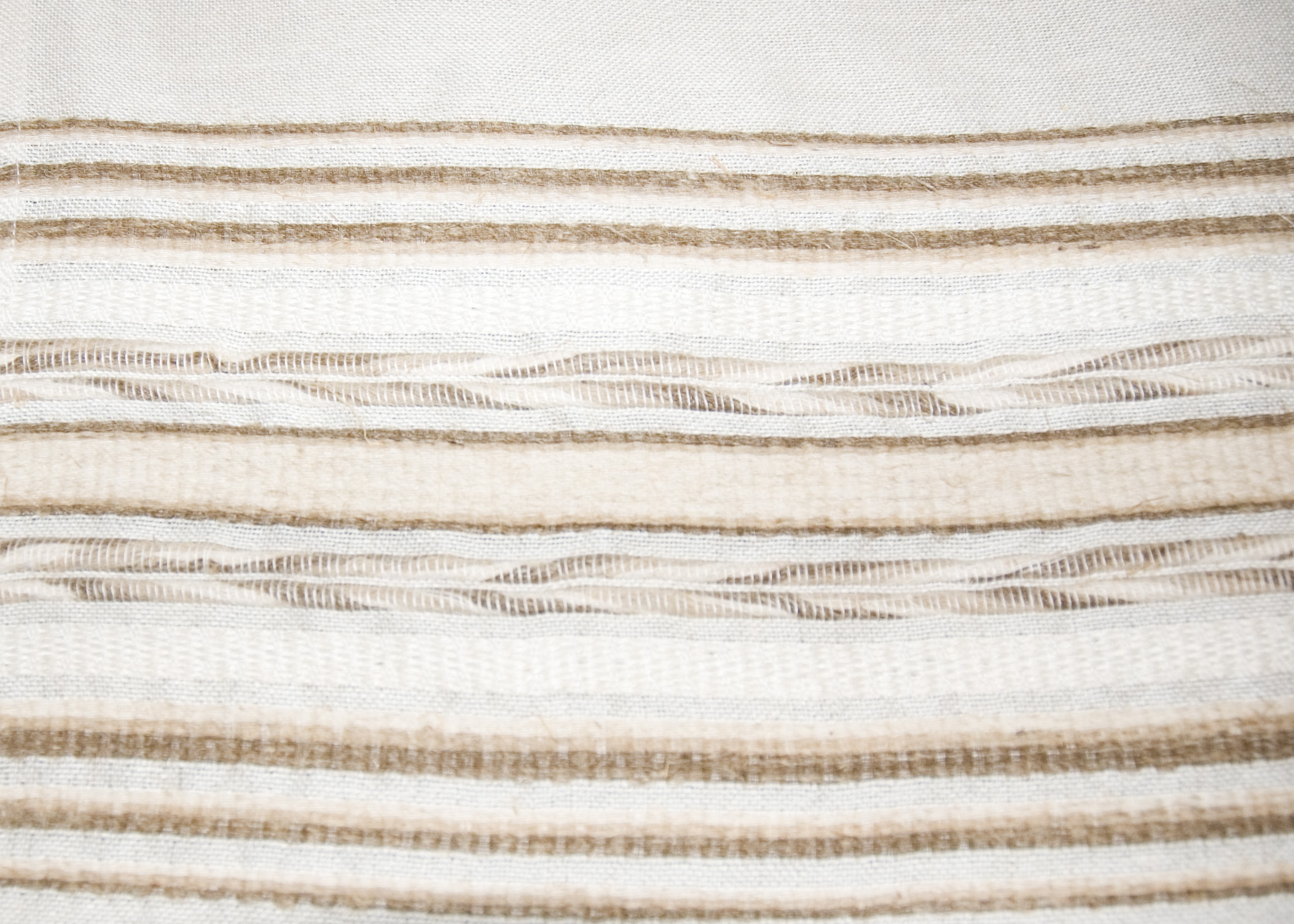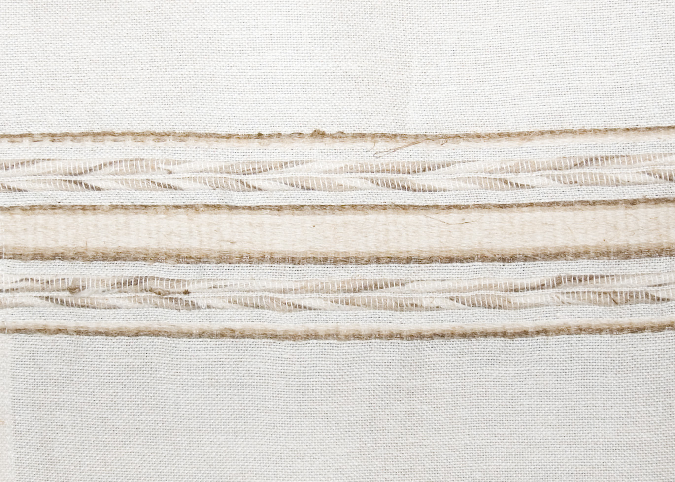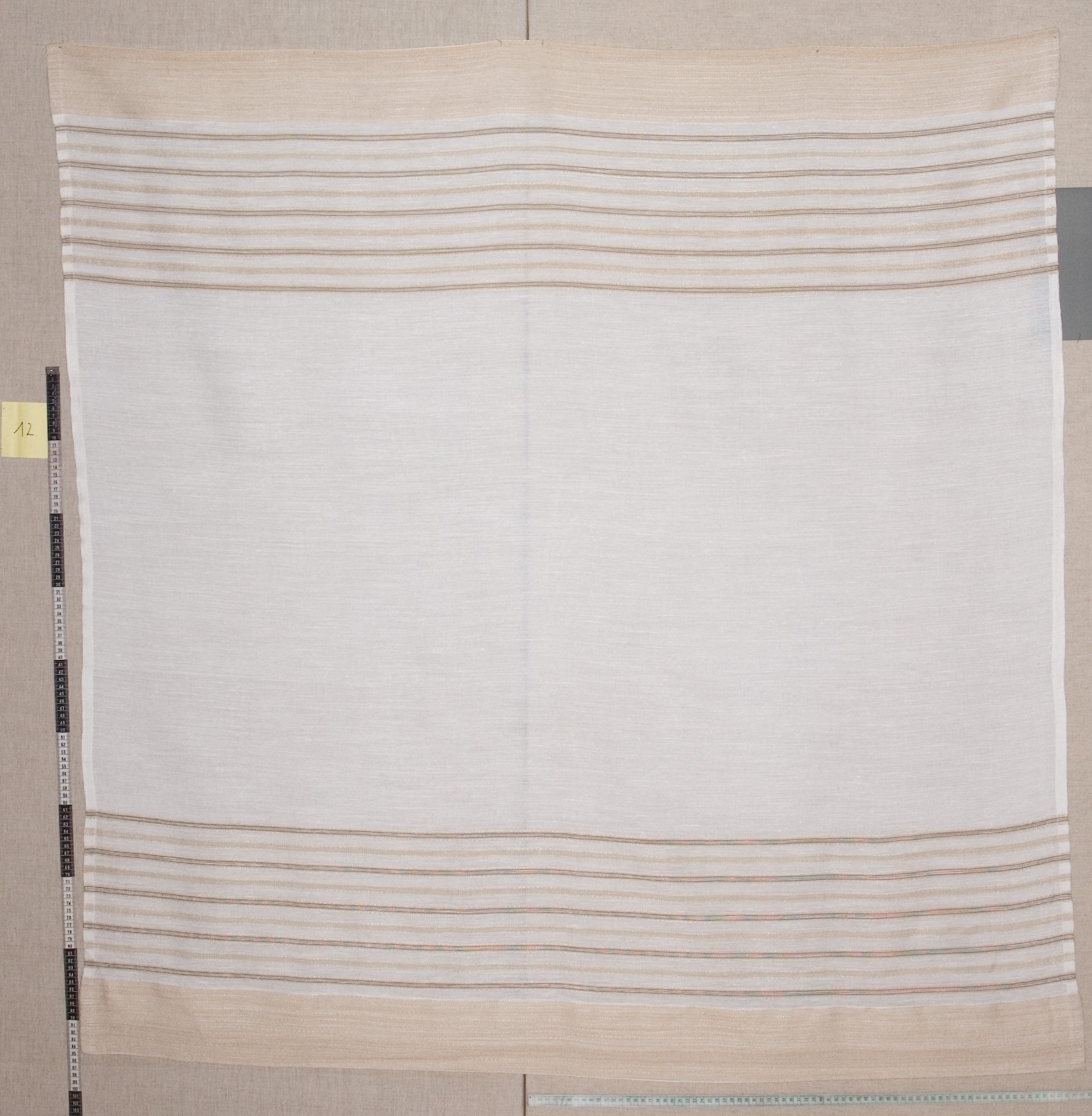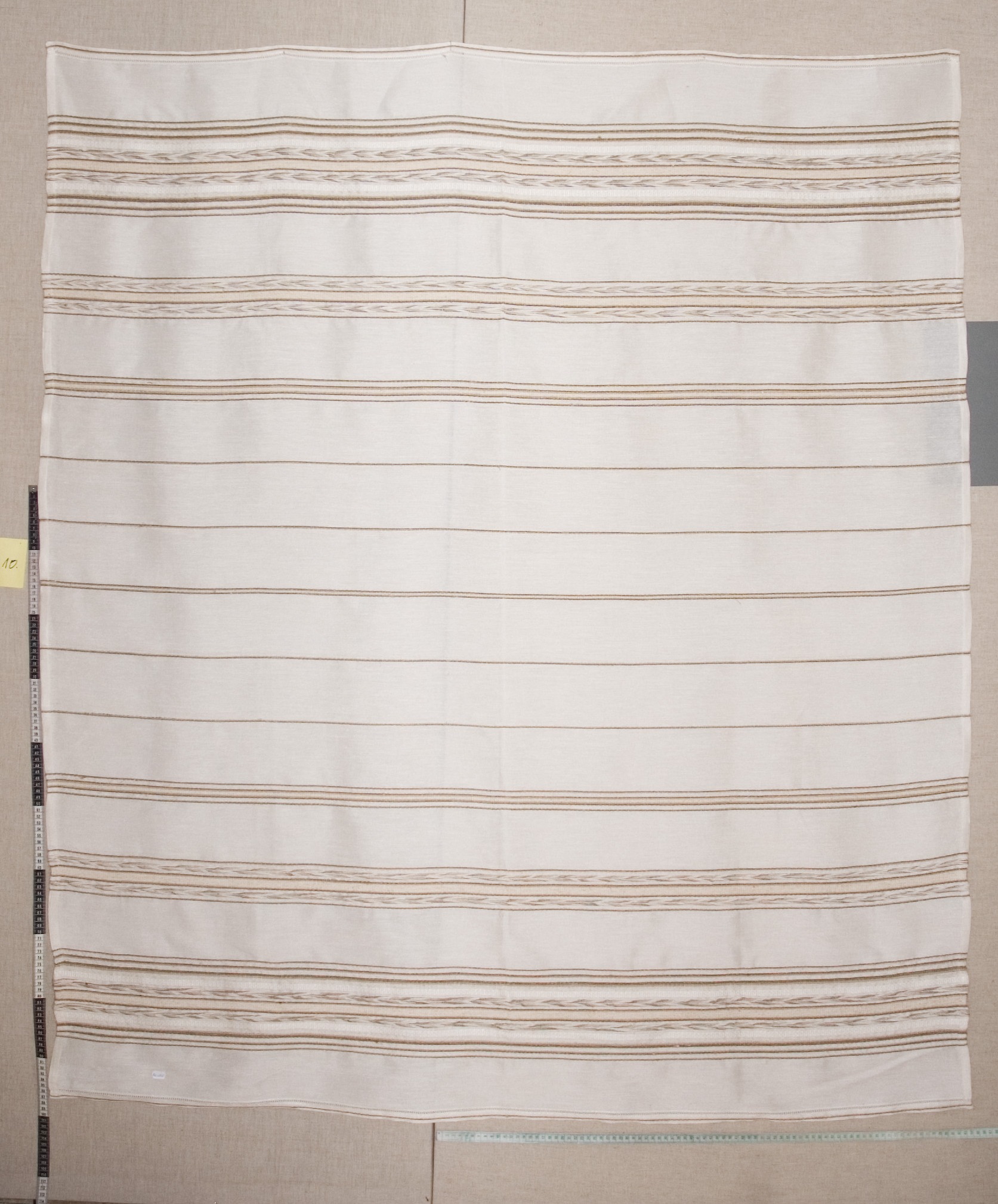 | Tárgyleírás | nyers alapú, ripsz és vászon sötétebb csíkokból bordür a végén, teritő közepe minta nélküli végét szines vászonszövés zárja. | |||
