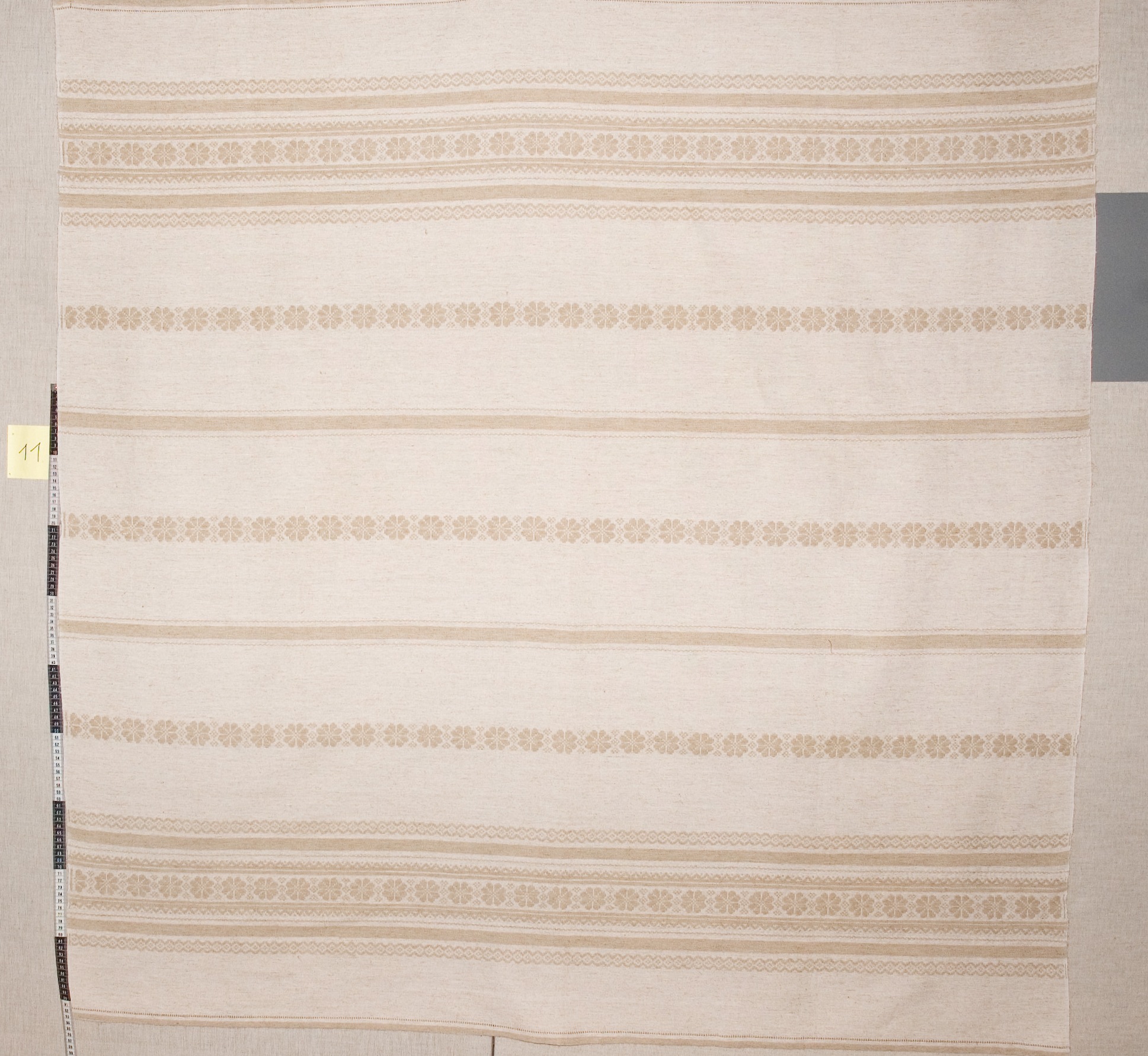 | Tárgyleírás | Nyers alapon szürke len átányi kerekrózsás szedett minta, hagyományos mintabeosztással.A kerek rózsa mellett cakksor disztiés található szedett mintával. | |||