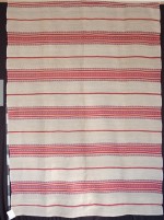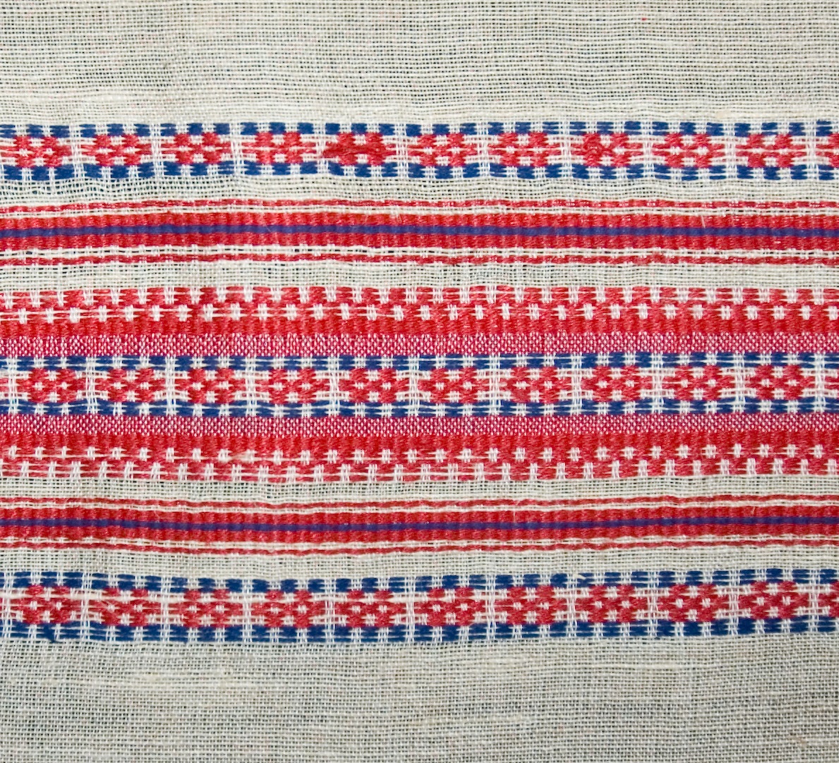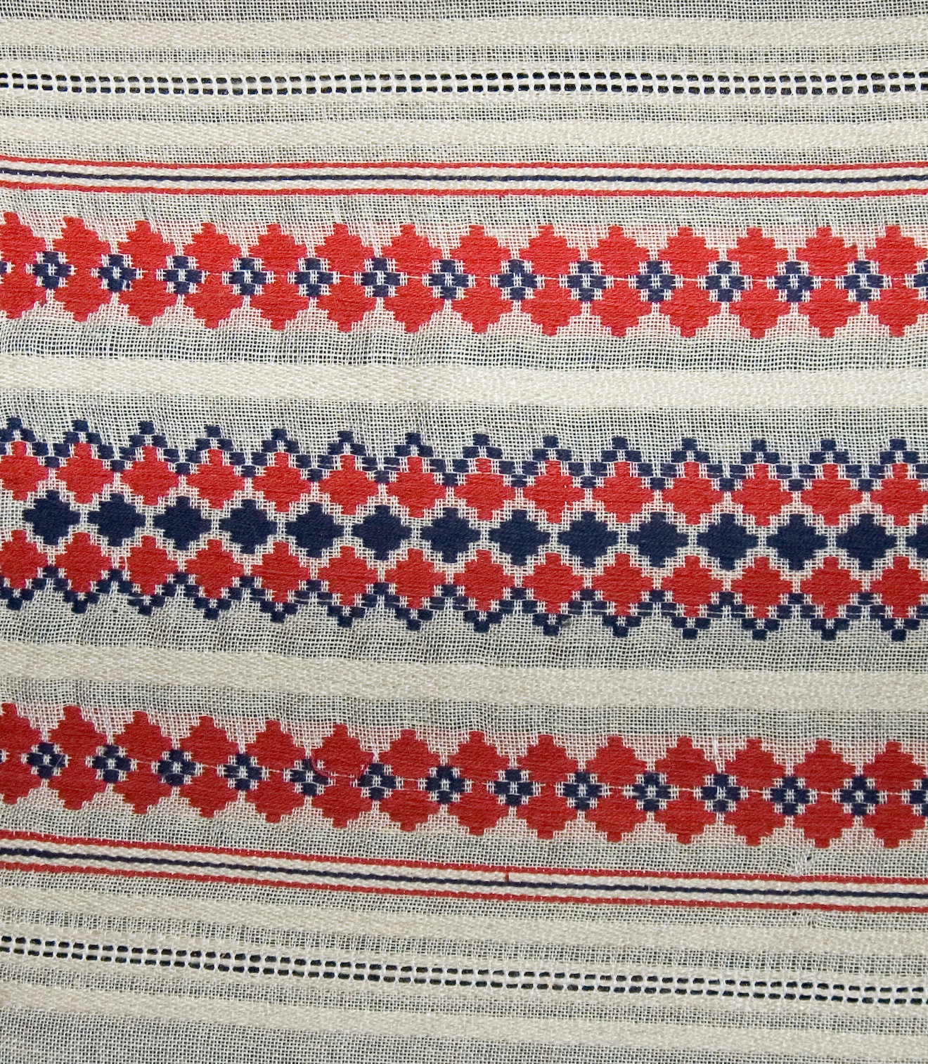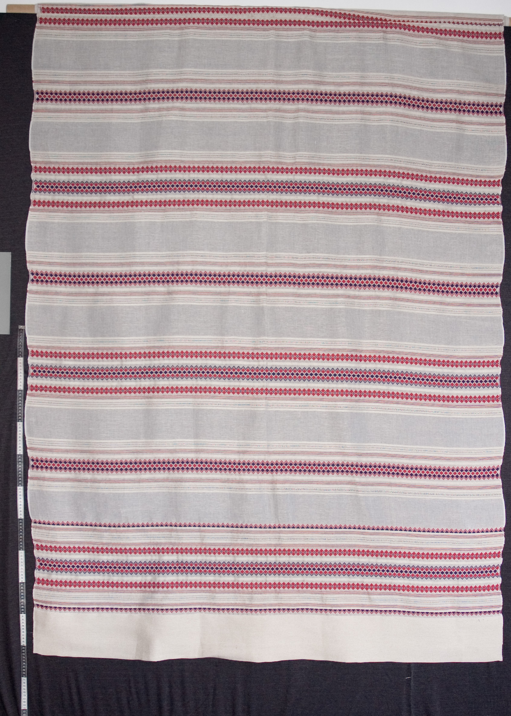 | Tárgyleírás | A száda felületét piros-kék színhatású, nyüstös minta díszíti, amelyeket ripsz csíkok kötnek össze. | |||