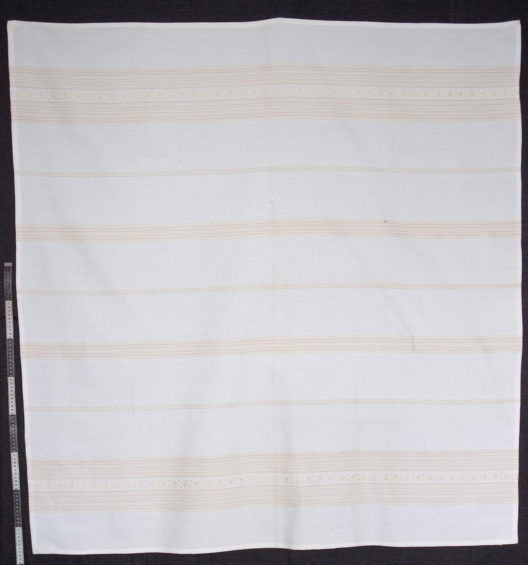 | Tárgyleírás | Az abrosz két végét hangsúlyosabb, szedett minta díszíti. | |||