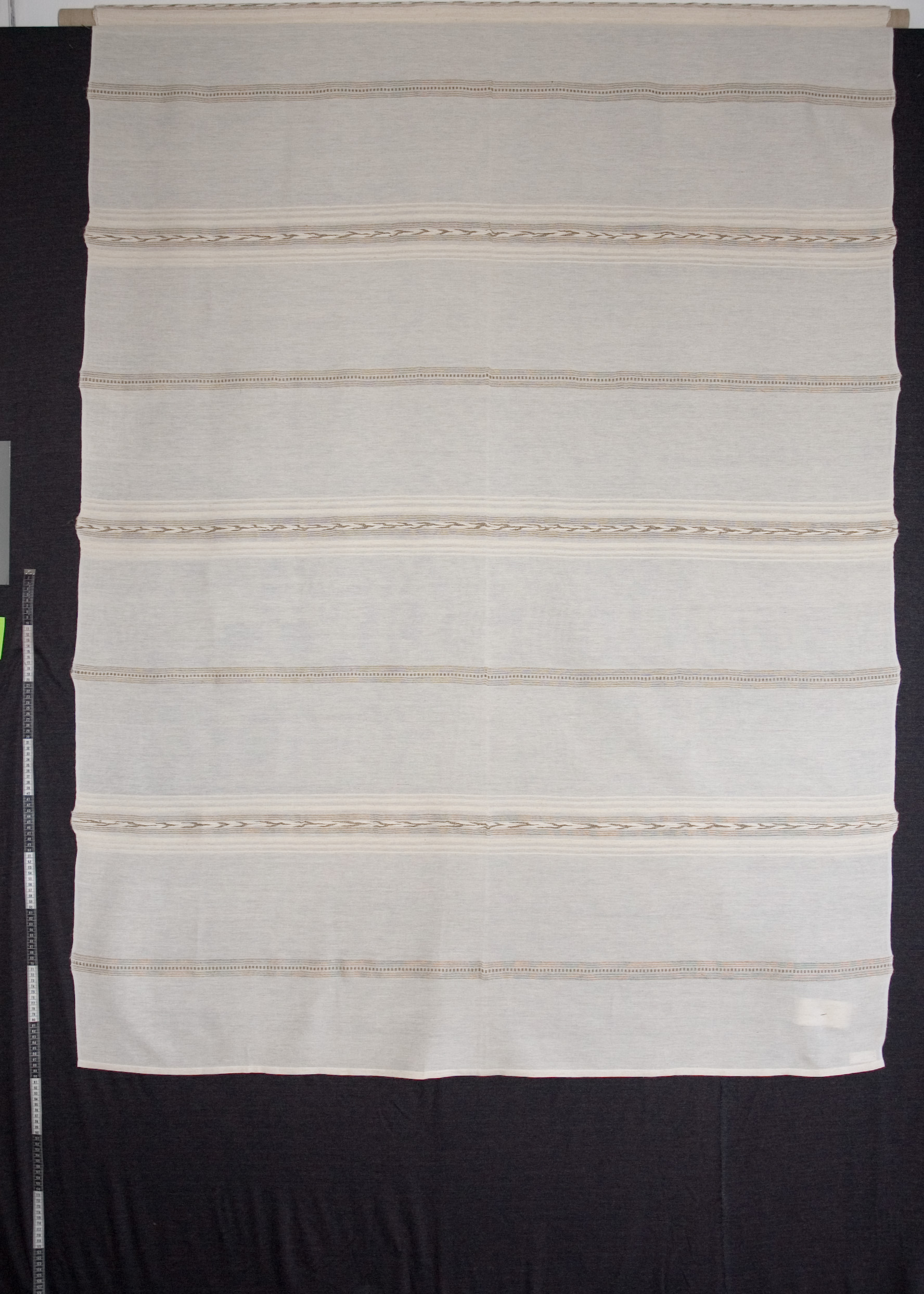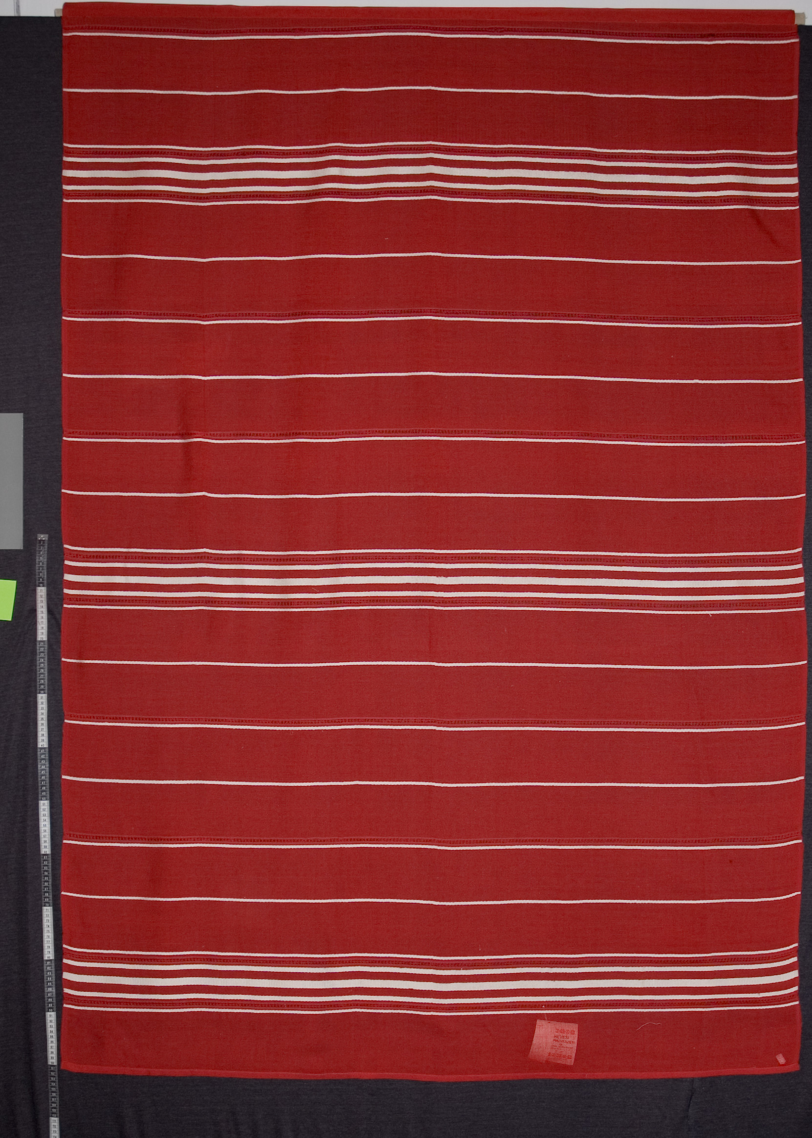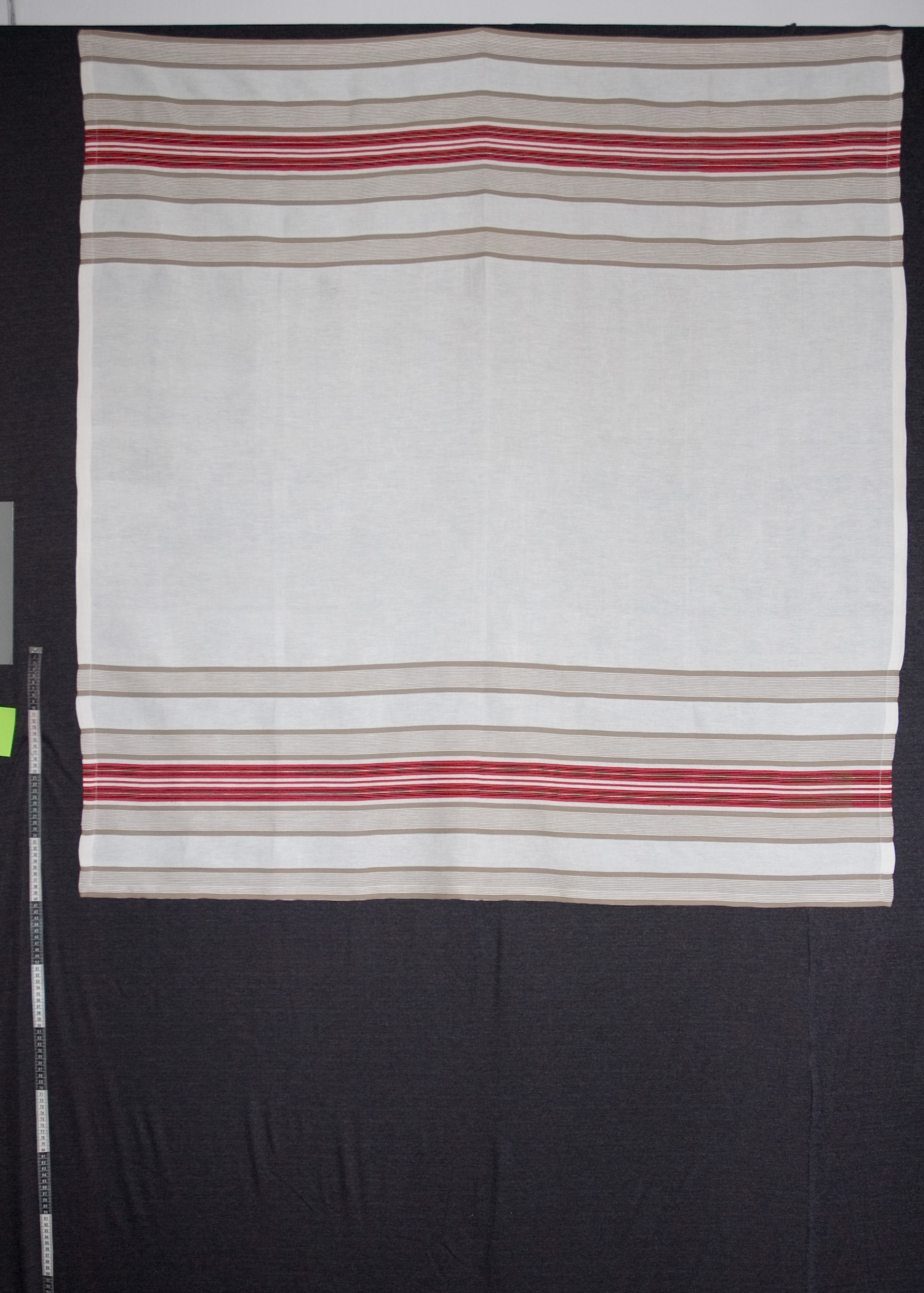 | Tárgyleírás | Az abrosz két végét súlyosabb, szürke-piros csíkritmus díszíti. | |||