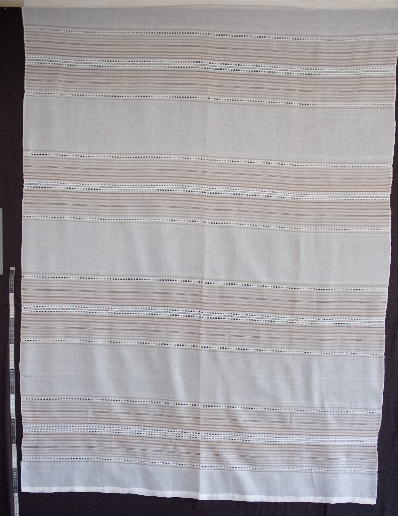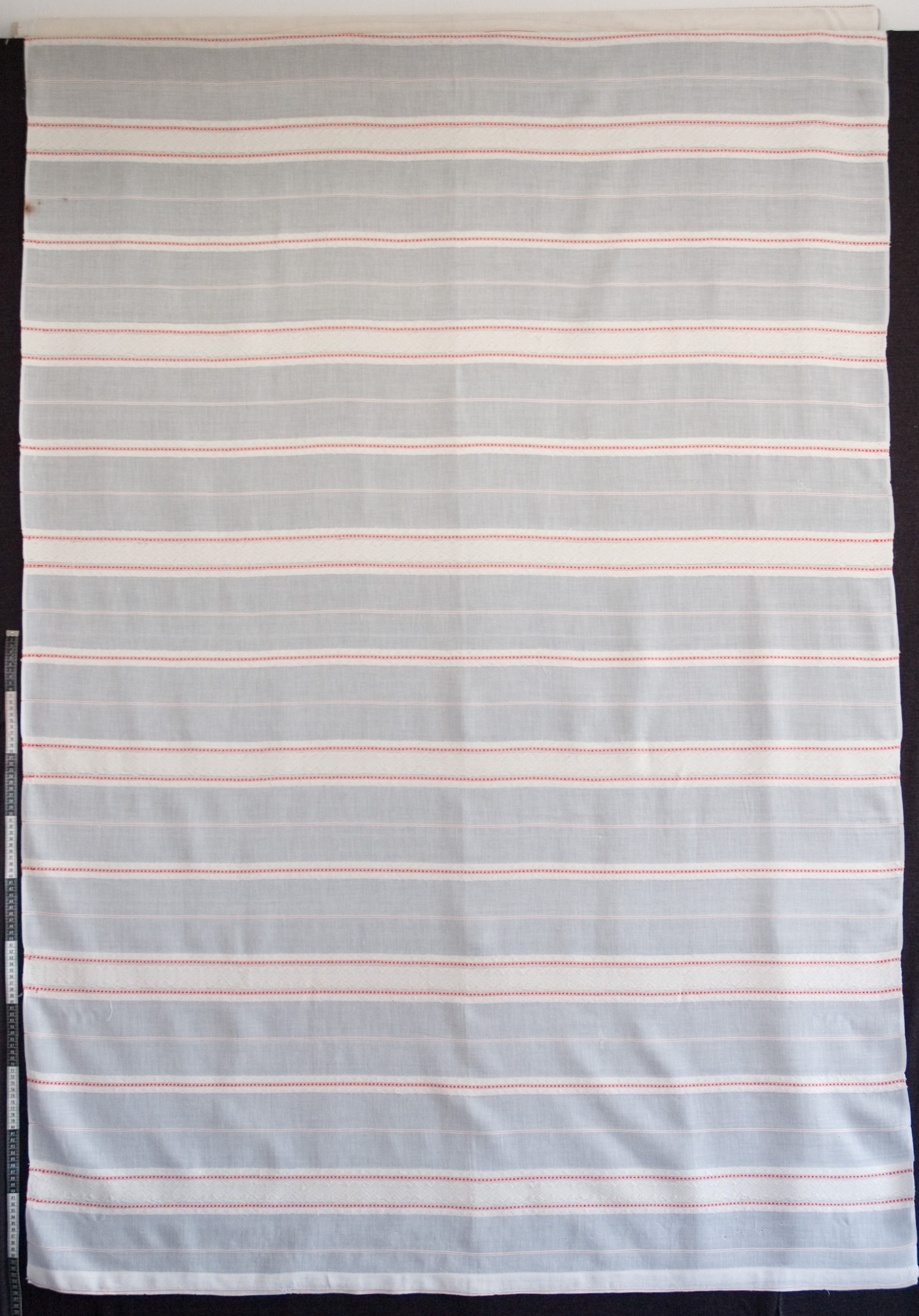 | Tárgyleírás | A pamut szádát folyamatosan ismétlődő, csíkritmusok díszítik, amelyeket középen kettős azsúr emel ki, a díszítmény mintázatát szélazsúr zárja. | |||