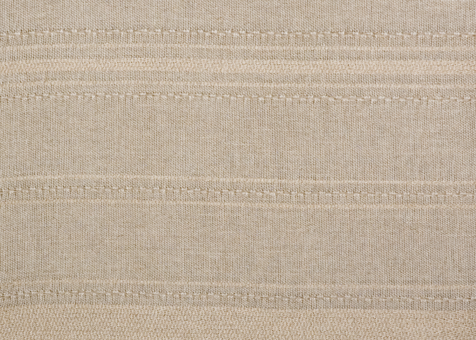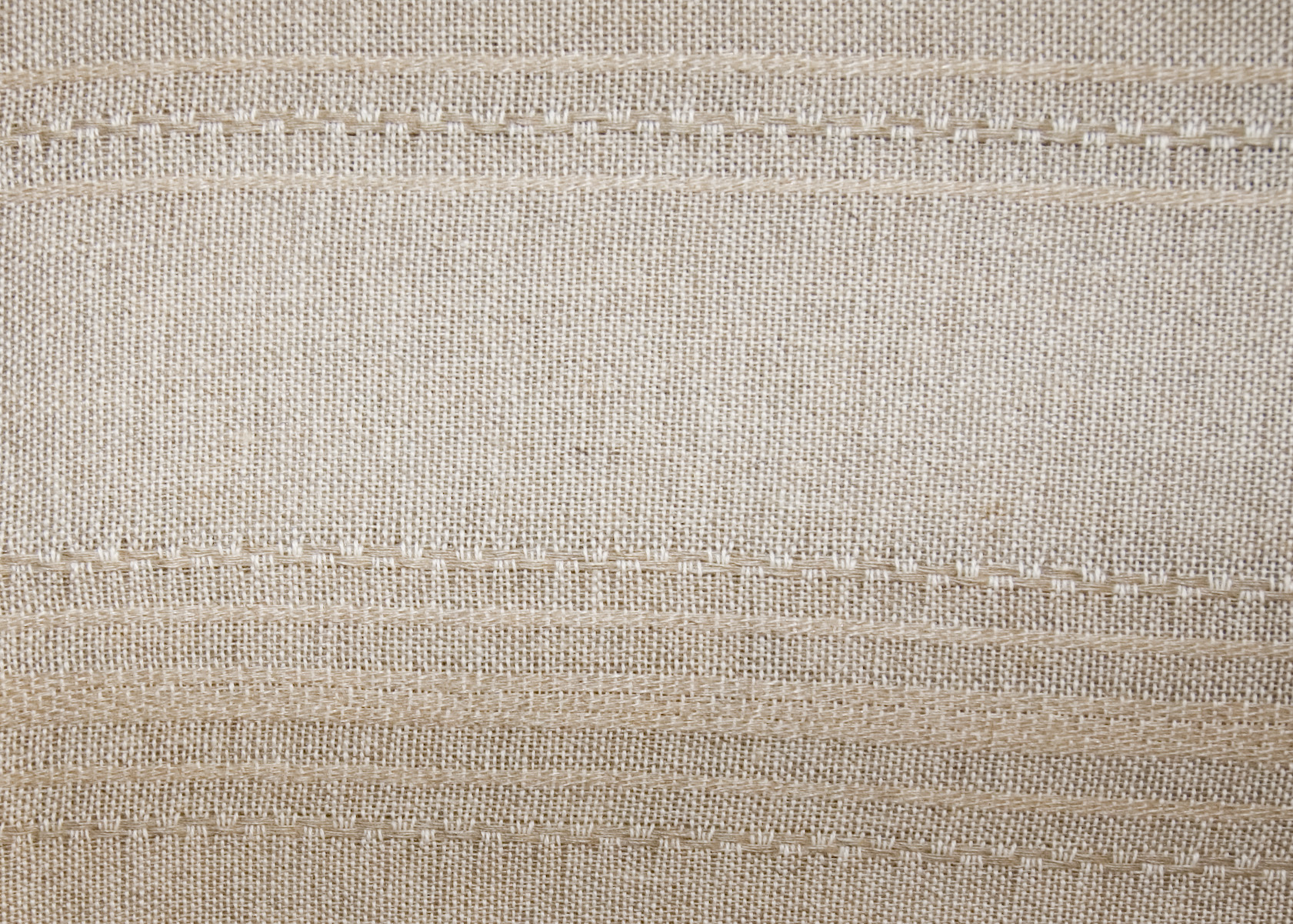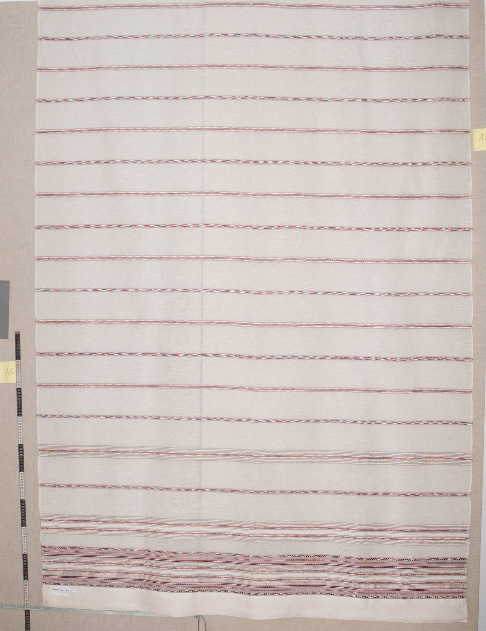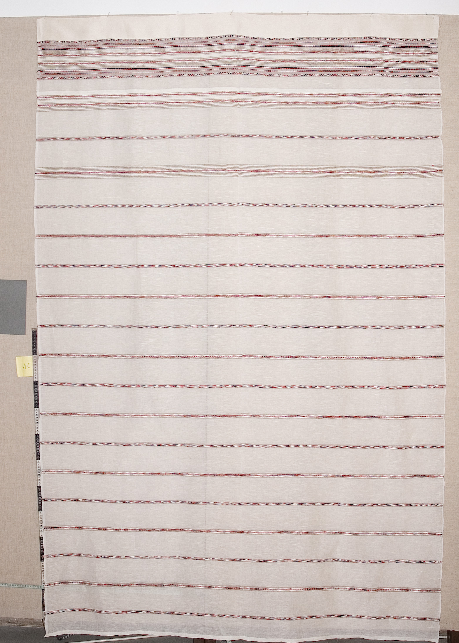 | Tárgyleírás | Szürke len anyagú sötétítő, amelynek a felületét az alapszínnel azonos ripsz és sávoly csíkozások díszítenek. | |||
