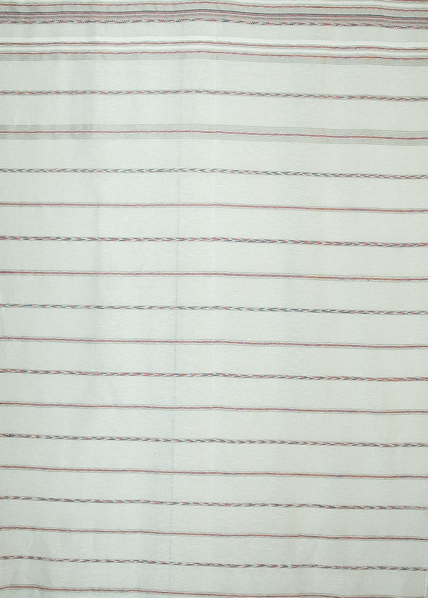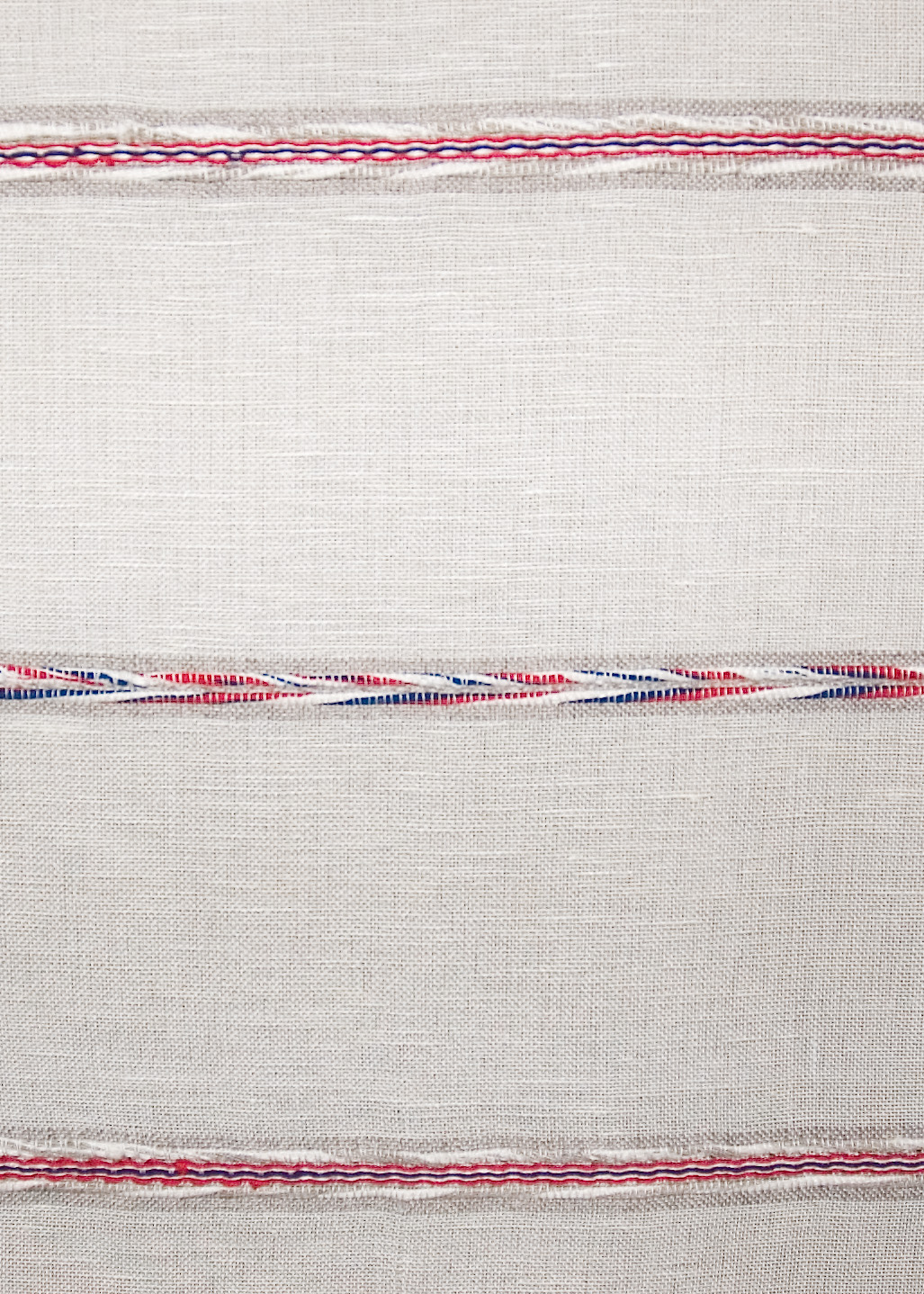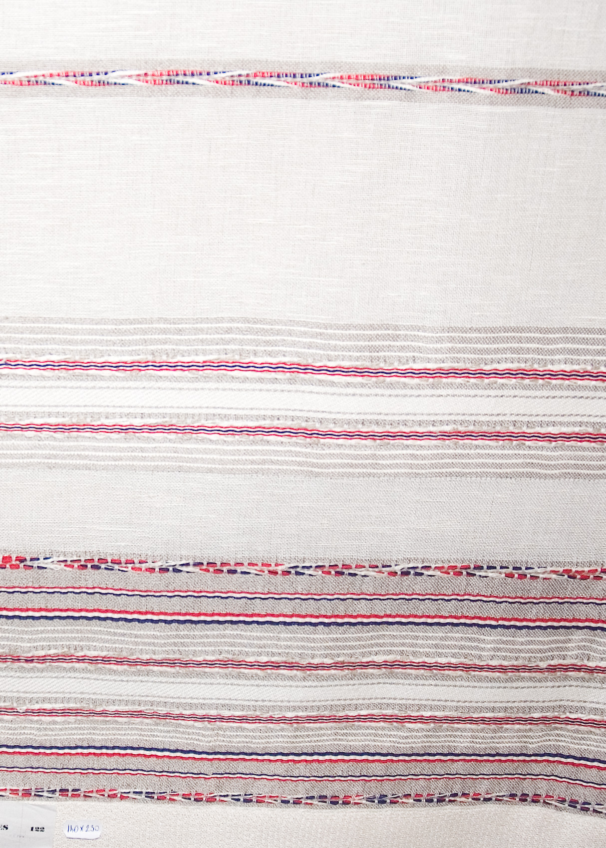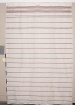 | Tárgyleírás | Szürke len anyagú sötétítő, amelynek a felületét az alapszínnel azonos ripsz és sávoly csíkozások díszítenek. | |||