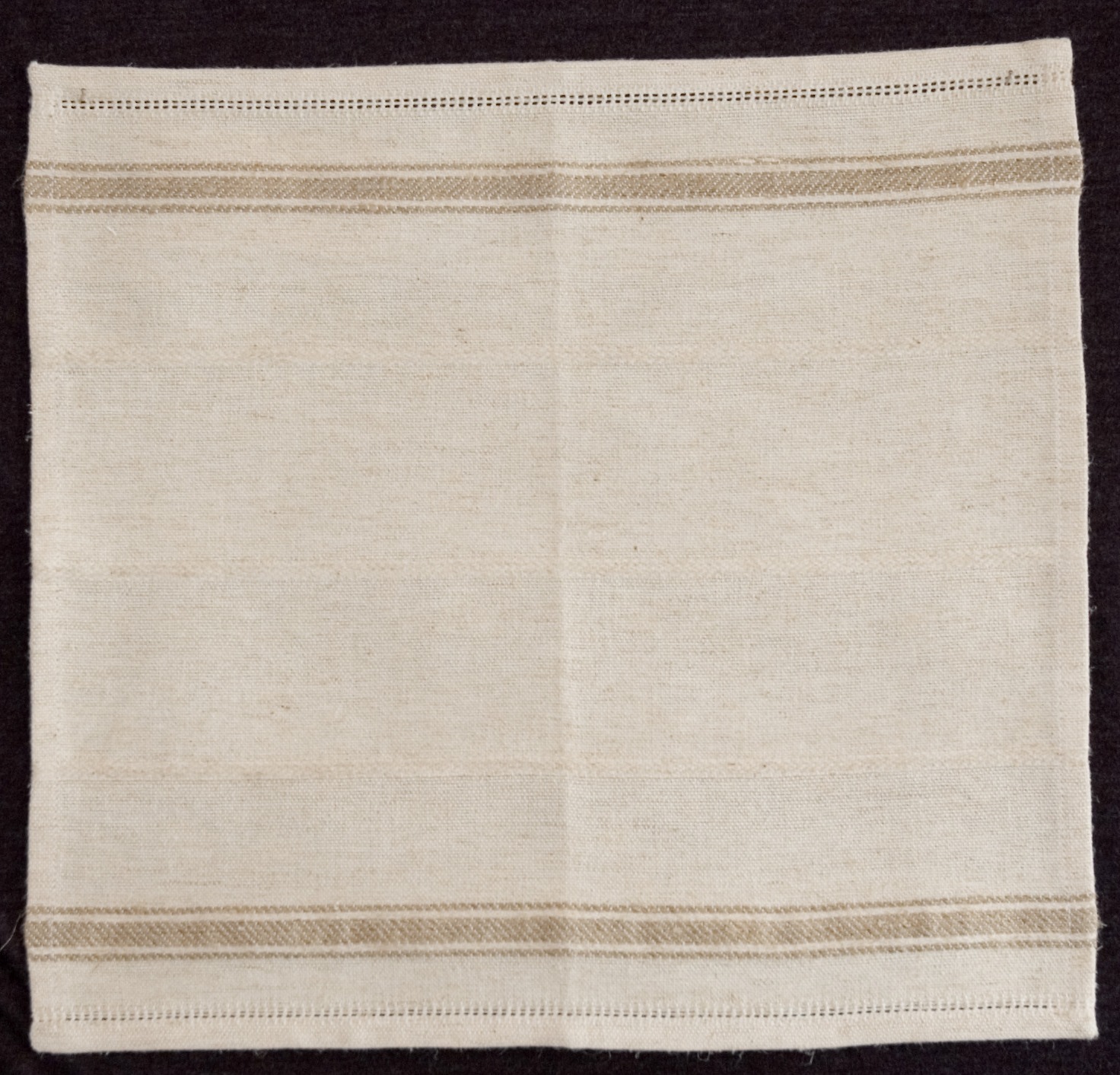 | Tárgyleírás | A len alapú tányér-alátét felső és alső szélét kender anyagú, sávoly csík díszíti, szegése azsúrral történt. | |||