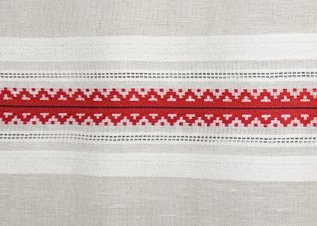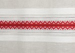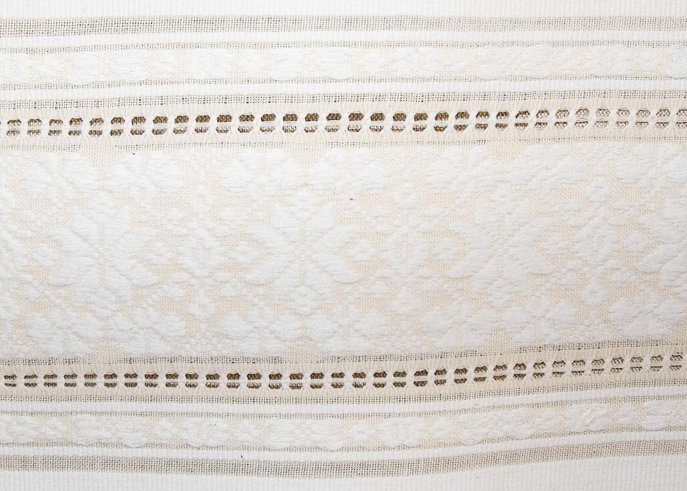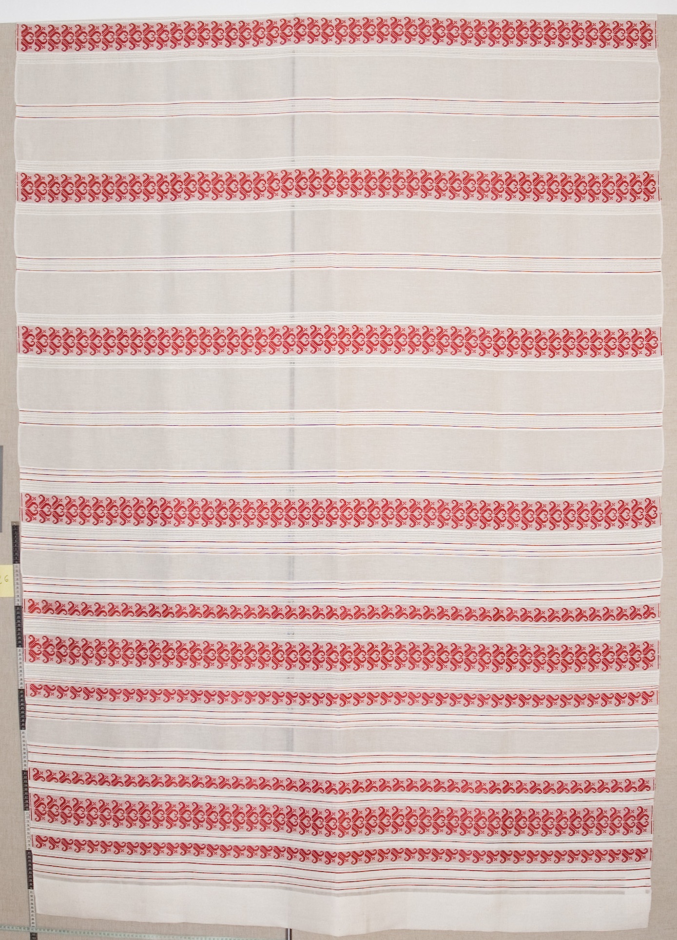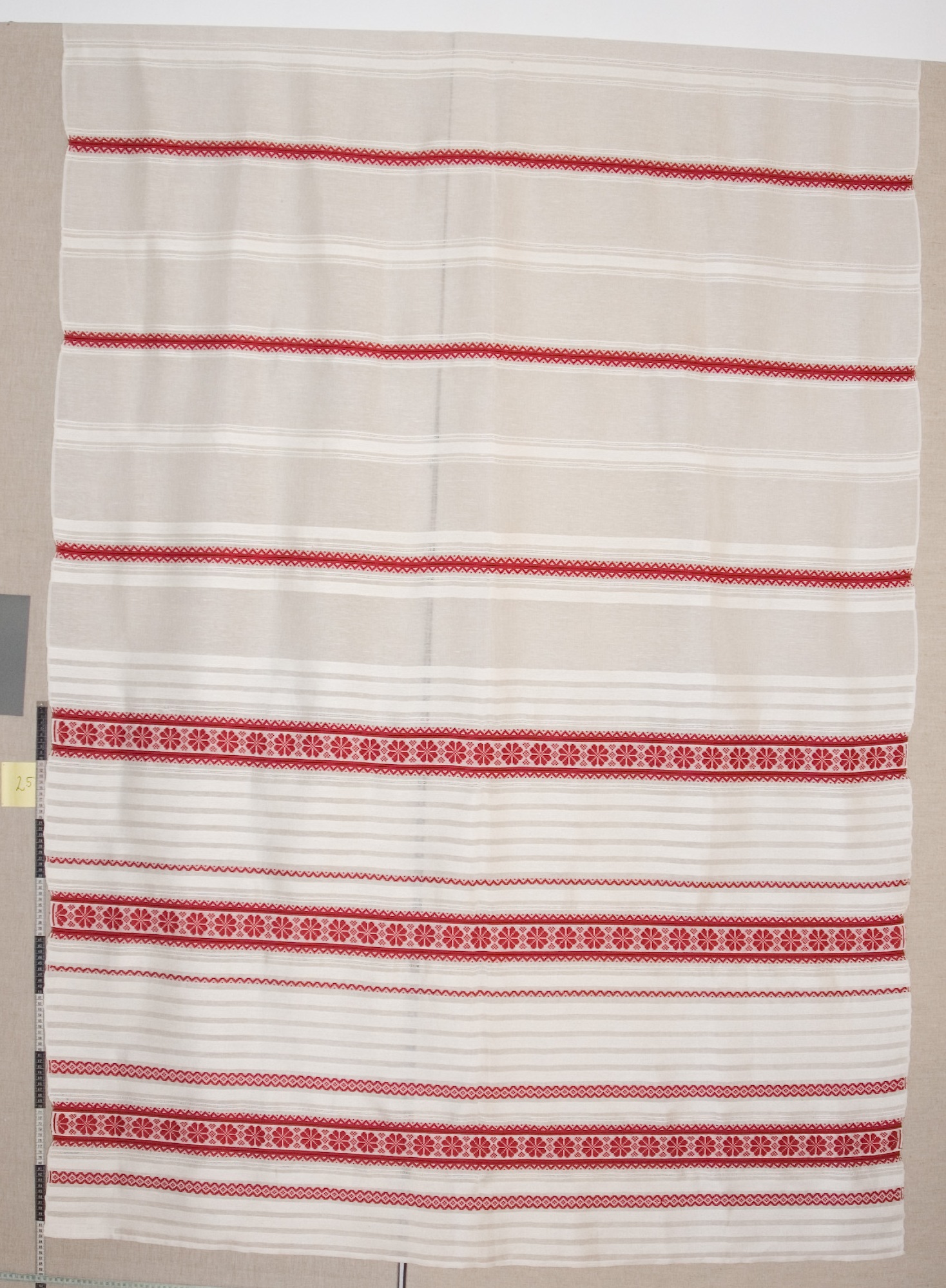 | Tárgyleírás | Len alapon, bordűrös elhelyezésben ismétlődő, szedett kerekrózsával, háromas sávoly csíkkal és azsúrral díszített függöny, amelynek a funkcionális /felső/ részét sávoly csíkok közé fogott, azsúrral kiemelt cakk-minták tagolják. | |||