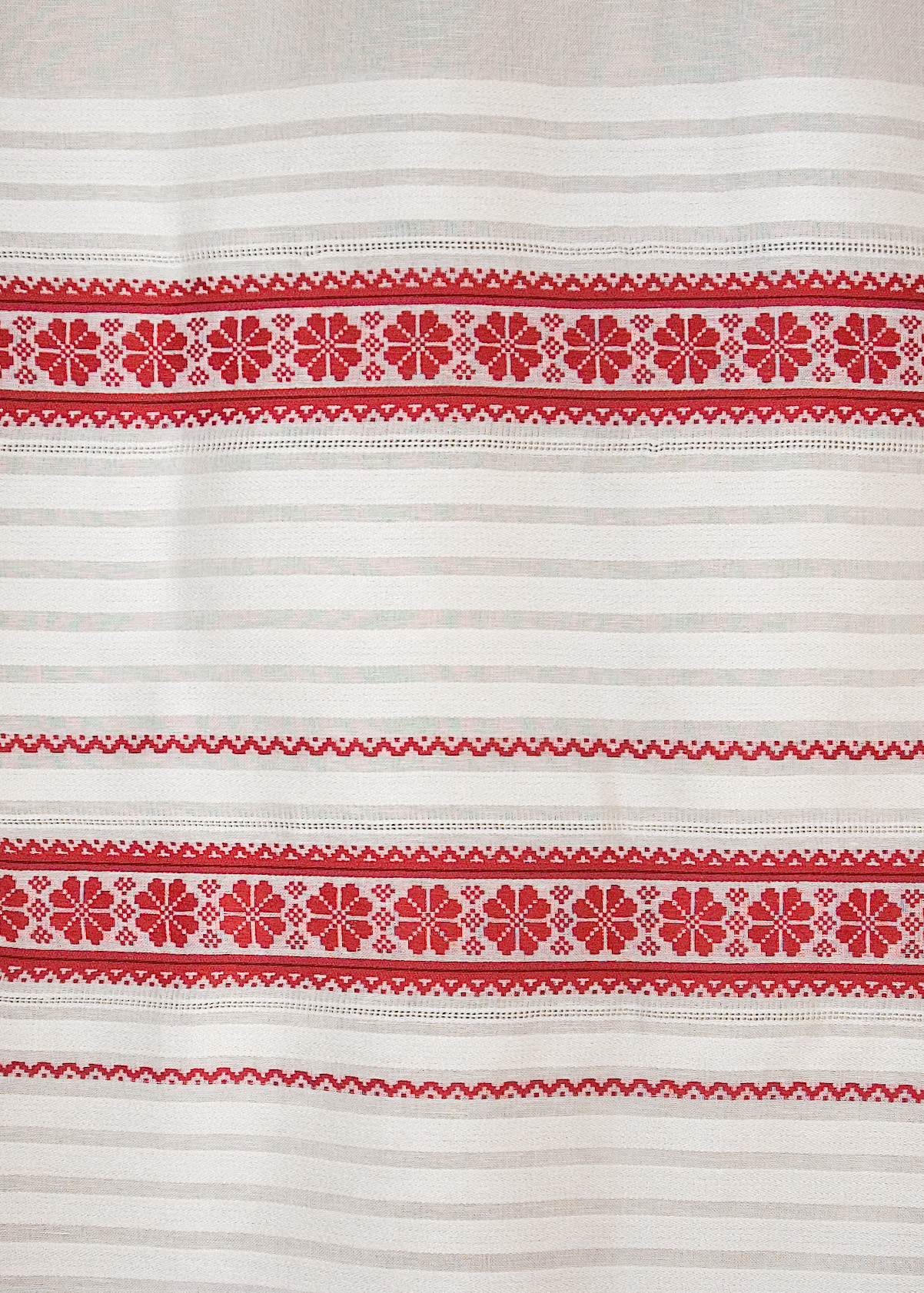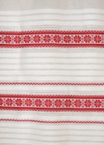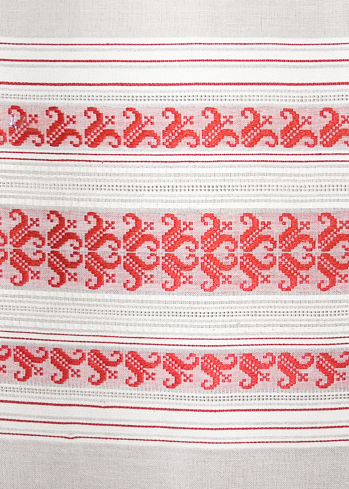 A szedett mintákat ripsz csíkok és azsúrok emelik ki. Szerkesztésben a hevesi szőttes kiemelkedő példánya. | |||
